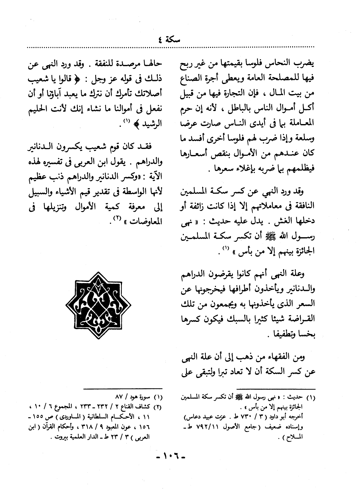 (1) حديث: " نهى رسول الله صلى الله عليه وسلم أن تكسر سكة المسلمين الجائزة بينهم إلا من بأس ". أخرجه أبو داود (3 / 730 ط. عزت عبيد دعاس) وإسناده ضعيف (جامع الأصول 11 / 792 ط - الملاح) .
