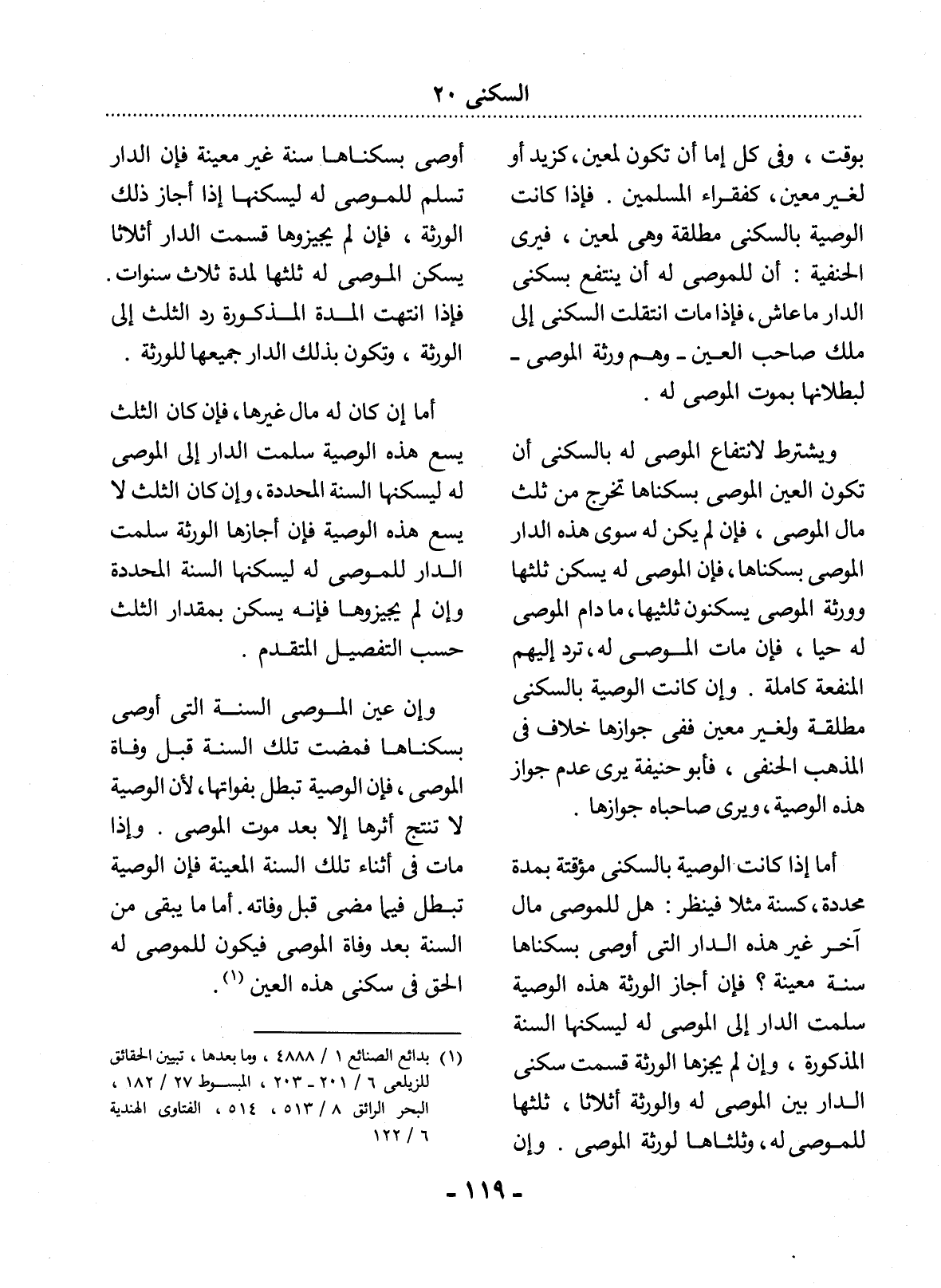 وَيُشْتَرَطُ لاِنْتِفَاعِ الْمُوصَى لَهُ بِالسُّكْنَى أَنْ تَكُونَ الْعَيْنُ الْمُوصَى بِسُكْنَاهَا تَخْرُجُ مِنْ ثُلُثِ مَال الْمُوصِي، فَإِنْ لَمْ يَكُنْ لَهُ سِوَى هَذِهِ الدَّارِ الْمُوصَى بِسُكْنَاهَا، فَإِنَّ الْمُوصَى لَهُ يَسْكُنُ ثُلُثَهَا وَوَرَثَةُ الْمُوصِي يَسْكُنُونَ ثُلُثَيْهَا، مَا دَامَ الْمُوصَى لَهُ حَيًّا، فَإِنْ مَاتَ الْمُوصَى لَهُ تُرَدُّ إِلَيْهِمِ الْمَنْفَعَةُ كَامِلَةً. وَإِنْ كَانَتِ الْوَصِيَّةُ بِالسُّكْنَى مُطْلَقَةً وَلِغَيْرِ مُعَيَّنٍ فَفِي جَوَازِهَا خِلاَفٌ فِي الْمَذْهَبِ الْحَنَفِيِّ، فَأَبُو حَنِيفَةَ يَرَى عَدَمَ جَوَازِ هَذِهِ الْوَصِيَّةِ، وَيَرَى صَاحِبَاهُ جَوَازَهَا.