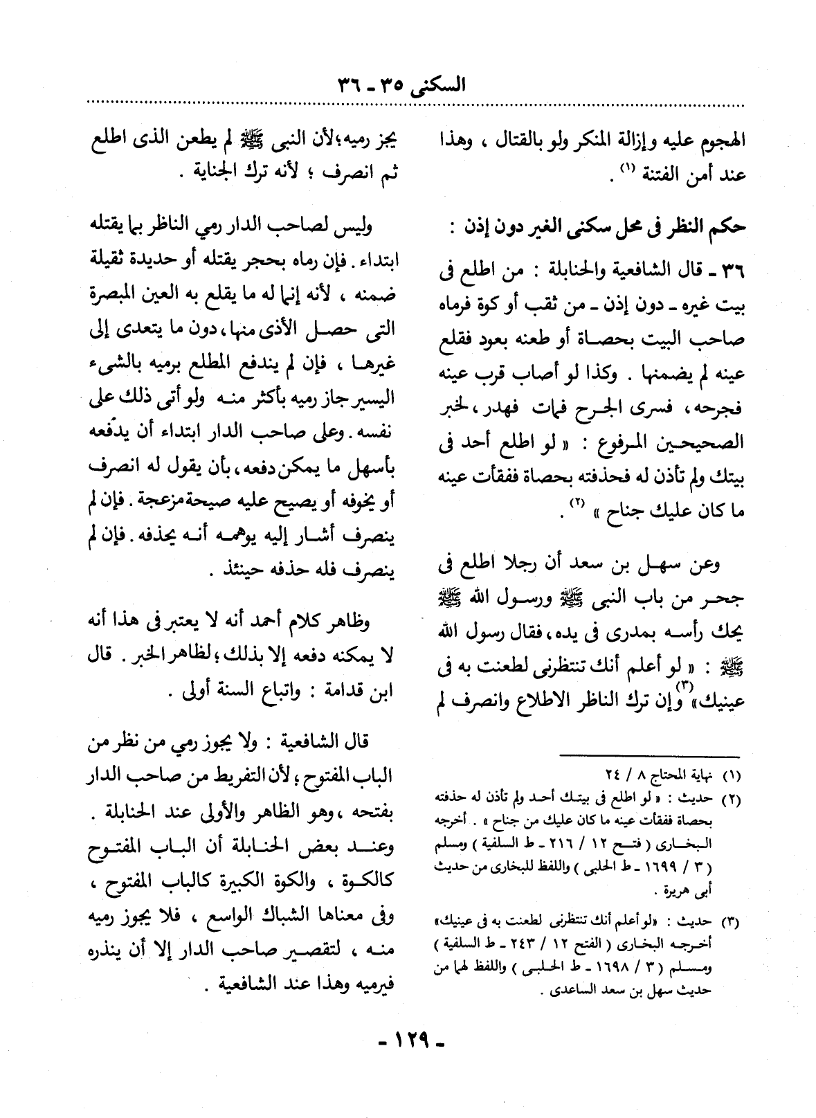 (2) حديث: " لو اطلع في بيتك أحد ولم تأذن له حذفته بحصاة ففقأت عينه ما كان عليك من جناح ". أخرجه البخاري (فتح12 / 216 - ط السلفية) ومسلم (3 / 1699 - ط الحلبي) واللفظ للبخاري من حديث أبي هريرة