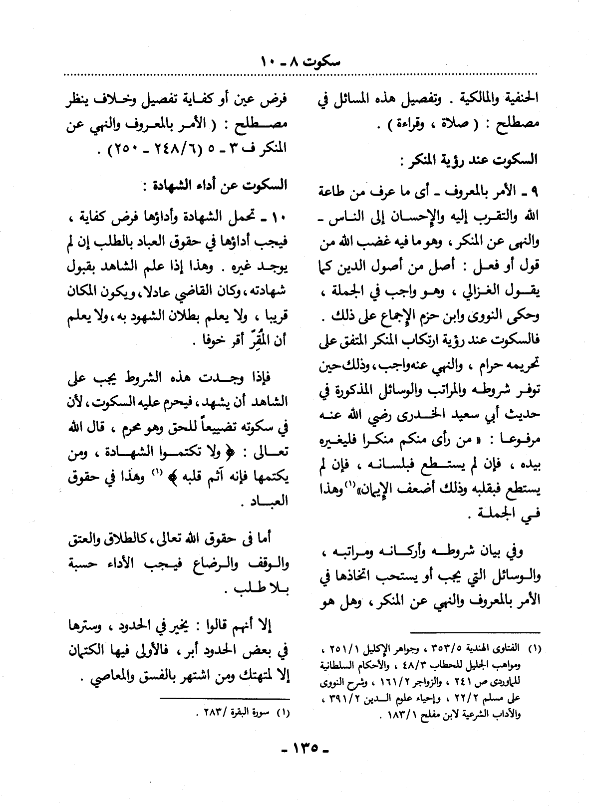 9 - الأَْمْرُ بِالْمَعْرُوفِ - أَيْ مَا عُرِفَ مِنْ طَاعَةِ اللَّهِ وَالتَّقَرُّبِ إِلَيْهِ وَالإِْحْسَانِ إِلَى النَّاسِ - وَالنَّهْيُ عَنِ الْمُنْكَرِ، وَهُوَ مَا فِيهِ غَضَبُ اللَّهِ مِنْ قَوْلٍ أَوْ فِعْلٍ - أَصْلٌ مِنْ أُصُول الدِّينِ كَمَا يَقُول الْغَزَالِيُّ، وَهُوَ وَاجِبٌ فِي الْجُمْلَةِ، وَحَكَى النَّوَوِيُّ وَابْنُ حَزْمٍ الإِْجْمَاعَ عَلَى ذَلِكَ. فَالسُّكُوتُ عِنْدَ رُؤْيَةِ ارْتِكَابِ الْمُنْكَرِ الْمُتَّفَقِ عَلَى تَحْرِيمِهِ حَرَامٌ، وَالنَّهْيُ عَنْهُ وَاجِبٌ، وَذَلِكَ حِينَ تَوَفُّرِ شُرُوطِهِ وَالْمَرَاتِبِ وَالْوَسَائِل الْمَذْكُورَةِ فِي حَدِيثِ أَبِي سَعِيدٍ الْخُدْرِيِّ رَضِيَ اللَّهُ عَنْهُ مَرْفُوعًا: مَنْ رَأَى مِنْكُمْ مُنْكَرًا فَلْيُغَيِّرْهُ بِيَدِهِ، فَإِنْ لَمْ يَسْتَطِعْ فَبِلِسَانِهِ، فَإِنْ لَمْ يَسْتَطِعْ فَبِقَلْبِهِ وَذَلِكَ أَضْعَفُ الإِْيمَانِ (1) وَهَذَا فِي الْجُمْلَةِ.