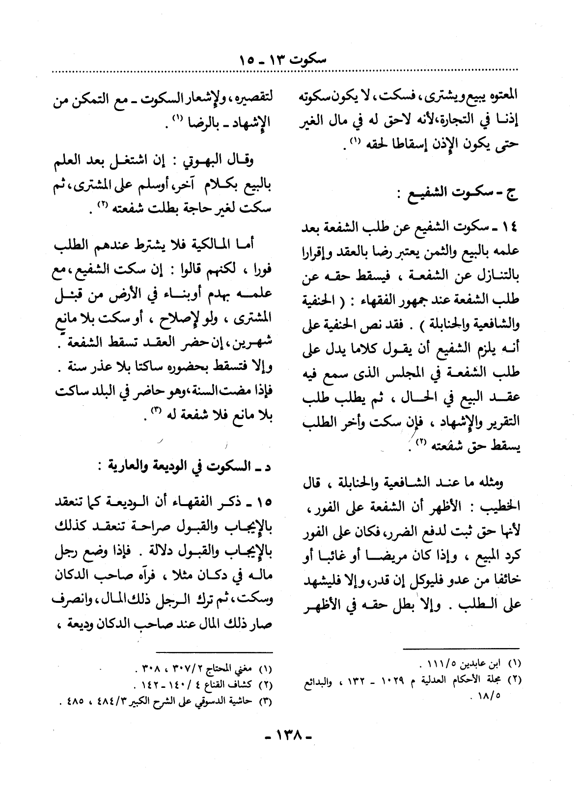 14 - سُكُوتُ الشَّفِيعِ عَنْ طَلَبِ الشُّفْعَةِ بَعْدَ عِلْمِهِ بِالْبَيْعِ وَالثَّمَنِ يُعْتَبَرُ رِضًا بِالْعَقْدِ وَإِقْرَارًا بِالتَّنَازُل عَنِ الشُّفْعَةِ، فَيَسْقُطُ حَقُّهُ عَنْ طَلَبِ الشُّفْعَةِ عِنْدَ جُمْهُورِ الْفُقَهَاءِ: (الْحَنَفِيَّةِ وَالشَّافِعِيَّةِ وَالْحَنَابِلَةِ) . فَقَدْ نَصَّ الْحَنَفِيَّةُ عَلَى أَنَّهُ يَلْزَمُ الشَّفِيعَ أَنْ يَقُول كَلاَمًا يَدُل عَلَى طَلَبِ الشُّفْعَةِ فِي الْمَجْلِسِ الَّذِي سَمِعَ فِيهِ عَقْدَ الْبَيْعِ فِي الْحَال، ثُمَّ يَطْلُبُ طَلَبَ التَّقْرِيرِ وَالإِْشْهَادِ، فَإِنْ سَكَتَ وَأَخَّرَ الطَّلَبَ يَسْقُطُ حَقُّ شُفْعَتِهِ (2) .