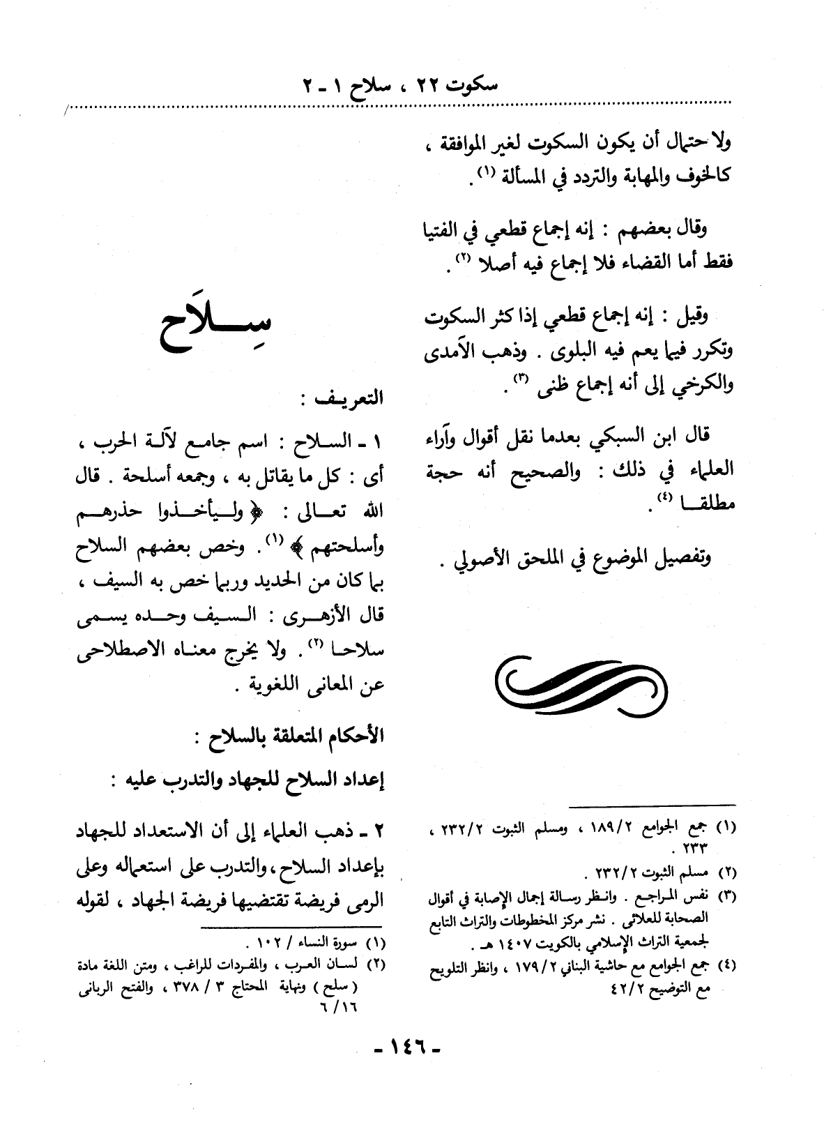 (2) لسان العرب، والمفردات للراغب، ومتن اللغة مادة (سلح) ونهاية المحتاج 3 / 378، والفتح الرباني 16 / 6.