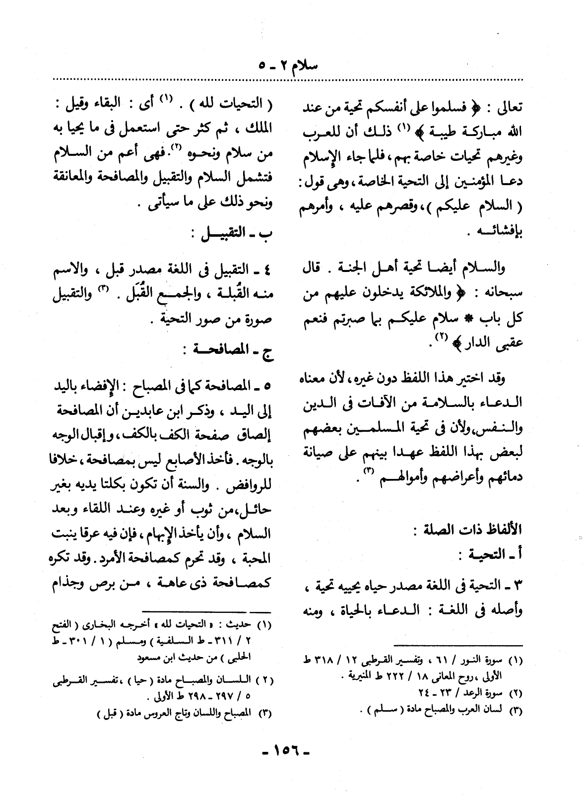 {فَسَلِّمُوا عَلَى أَنْفُسِكُمْ تَحِيَّةً مِنْ عِنْدِ اللَّهِ مُبَارَكَةً طَيْبَةً} (1) ذَلِكَ أَنَّ لِلْعَرَبِ وَغَيْرِهِمْ تَحِيَّاتٍ خَاصَّةً بِهِمْ، فَلَمَّا جَاءَ الإِْسْلاَمُ دَعَا الْمُؤْمِنِينَ إِلَى التَّحِيَّةِ الْخَاصَّةِ، وَهِيَ قَوْل: (السَّلاَمُ عَلَيْكُمْ) ، وَقَصَرَهُمْ عَلَيْهِ، وَأَمَرَهُمْ بِإِفْشَائِهِ.