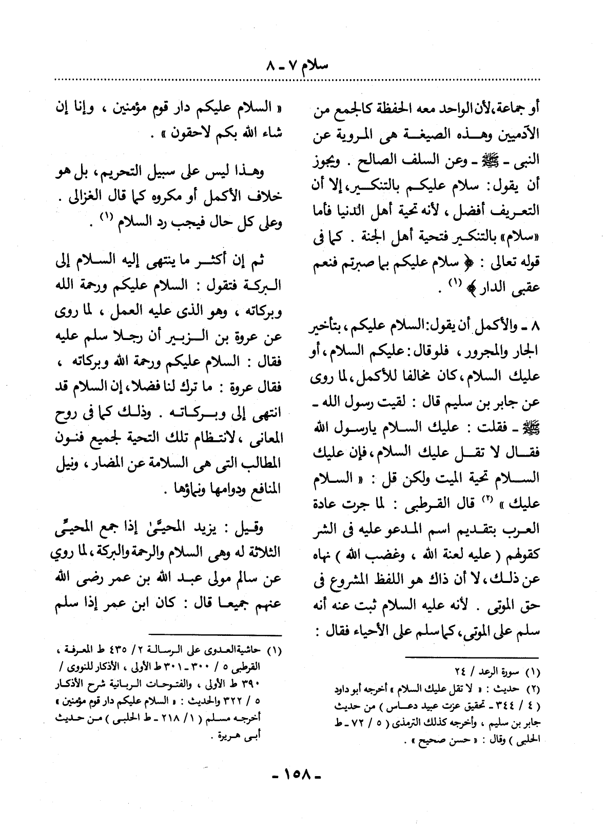 (1) حاشية العدوي على الرسالة 2 / 435 ط المعرفة، القرطبي 5 / 300 - 301 ط الأولى، الأذكار للنووي 390 ط الأولى، والفتوحات الربانية شرح الأذكار 5 / 322 والحديث: " السلام عليكم دار قوم مؤمنين " أخرجه مسلم (1 / 218 - ط الحلبي) من حديث أبي هريرة.