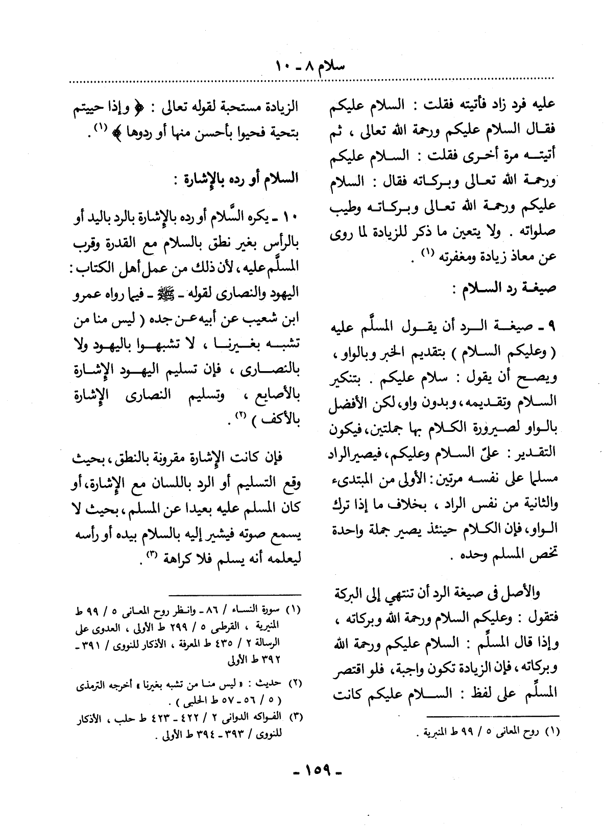 10 - يُكْرَهُ السَّلاَمُ أَوْ رَدُّهُ بِالإِْشَارَةِ بِالرَّدِّ بِالْيَدِ أَوْ بِالرَّأْسِ بِغَيْرِ نُطْقٍ بِالسَّلاَمِ مَعَ الْقُدْرَةِ وَقُرْبِ الْمُسَلَّمِ عَلَيْهِ؛ لأَِنَّ ذَلِكَ مِنْ عَمَل أَهْل الْكِتَابِ: الْيَهُودِ وَالنَّصَارَى لِقَوْلِهِ - صَلَّى اللَّهُ عَلَيْهِ وَسَلَّمَ - فِيمَا رَوَاهُ عَمْرُو بْنُ شُعَيْبٍ عَنْ أَبِيهِ عَنْ جَدِّهِ لَيْسَ مِنَّا مَنْ تَشَبَّهَ بِغَيْرِنَا، لاَ تَشَبَّهُوا بِالْيَهُودِ وَلاَ بِالنَّصَارَى، فَإِنَّ تَسْلِيمَ الْيَهُودِ الإِْشَارَةُ بِالأَْصَابِعِ، وَتَسْلِيمَ النَّصَارَى الإِْشَارَةُ بِالأَْكُفِّ (2) . فَإِنْ كَانَتِ الإِْشَارَةُ مَقْرُونَةً بِالنُّطْقِ، بِحَيْثُ وَقَعَ التَّسْلِيمُ أَوِ الرَّدُّ بِاللِّسَانِ مَعَ الإِْشَارَةِ، أَوْ كَانَ الْمُسَلَّمُ عَلَيْهِ بَعِيدًا عَنِ الْمُسَلِّمِ، بِحَيْثُ لاَ يَسْمَعُ صَوْتَهُ فَيُشِيرُ إِلَيْهِ بِالسَّلاَمِ بِيَدِهِ أَوْ رَأْسِهِ لِيُعْلِمَهُ أَنَّهُ يُسَلِّمُ، فَلاَ كَرَاهَةَ (3) .