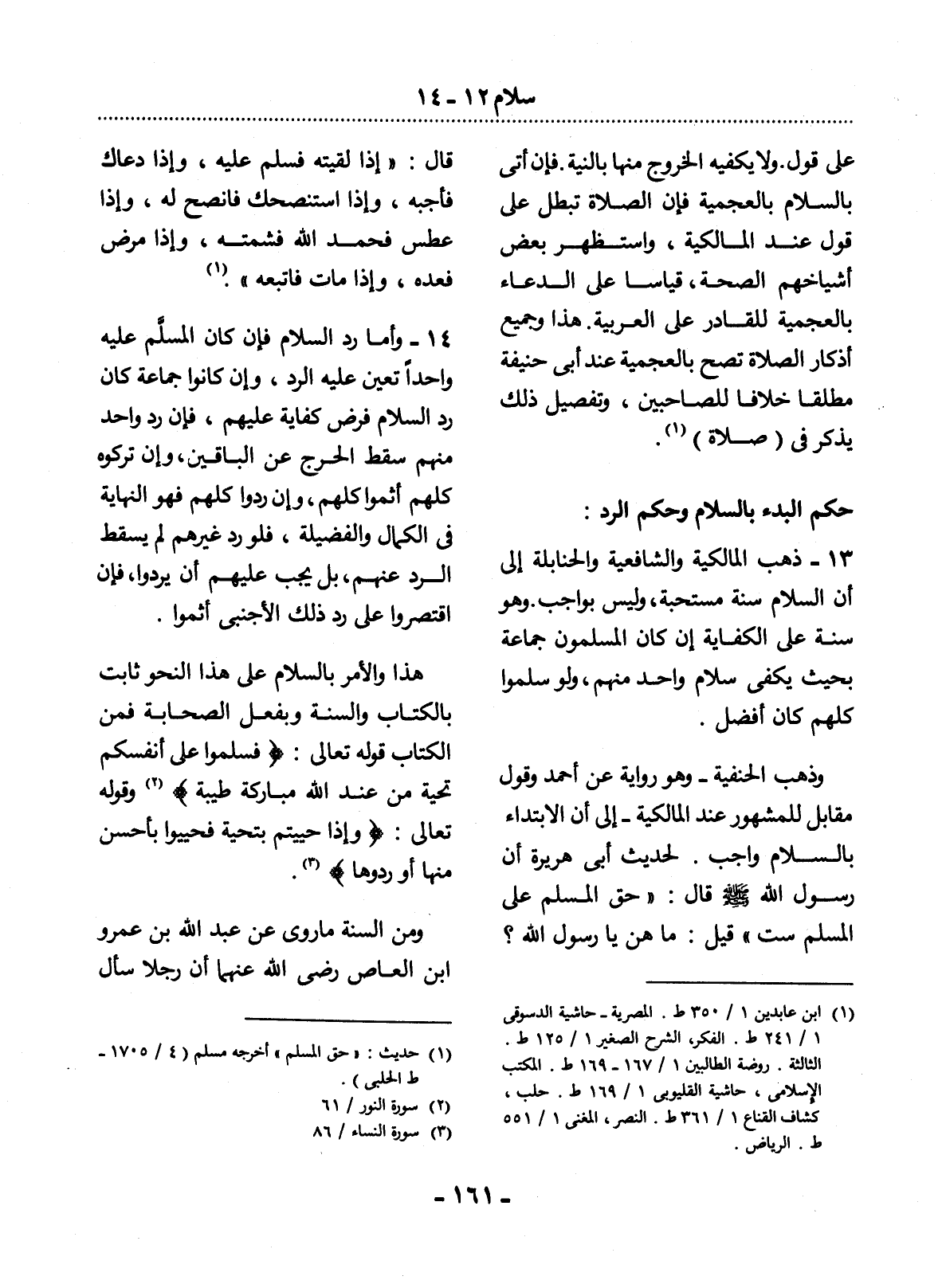 13 - ذَهَبَ الْمَالِكِيَّةُ وَالشَّافِعِيَّةُ وَالْحَنَابِلَةُ إِلَى أَنَّ السَّلاَمَ سُنَّةٌ مُسْتَحَبَّةٌ وَلَيْسَ بِوَاجِبٍ، وَهُوَ سُنَّةٌ عَلَى الْكِفَايَةِ إِنْ كَانَ الْمُسَلِّمُونَ جَمَاعَةً بِحَيْثُ يَكْفِي سَلاَمُ وَاحِدٍ مِنْهُمْ، وَلَوْ سَلَّمُوا كُلُّهُمْ كَانَ أَفْضَل.