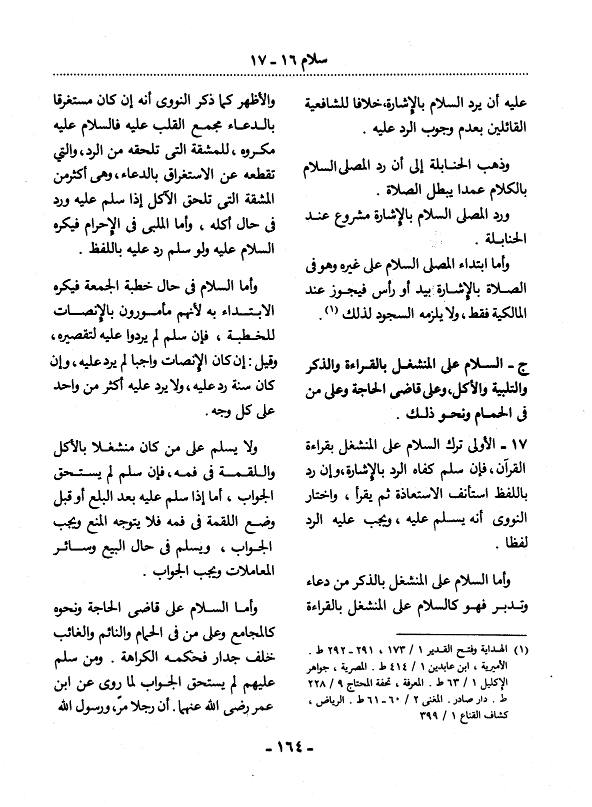 17 - الأَْوْلَى تَرْكُ السَّلاَمِ عَلَى الْمُنْشَغِل بِقِرَاءَةِ الْقُرْآنِ، فَإِنْ سَلَّمَ كَفَاهُ الرَّدُّ بِالإِْشَارَةِ، وَإِنْ رَدَّ بِاللَّفْظِ اسْتَأْنَفَ الاِسْتِعَاذَةَ ثُمَّ يَقْرَأُ، وَاخْتَارَ النَّوَوِيُّ أَنَّهُ يُسَلِّمُ عَلَيْهِ، وَيَجِبُ عَلَيْهِ الرَّدُّ لَفْظًا.