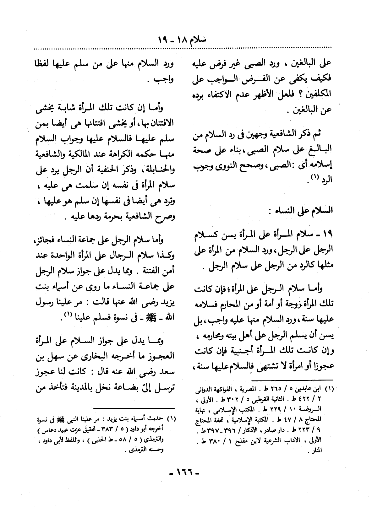 19 - سَلاَمُ الْمَرْأَةِ عَلَى الْمَرْأَةِ يُسَنُّ كَسَلاَمِ الرَّجُل عَلَى الرَّجُل، وَرَدُّ السَّلاَمِ مِنَ الْمَرْأَةِ عَلَى مِثْلِهَا كَالرَّدِّ مِنَ الرَّجُل عَلَى سَلاَمِ الرَّجُل.