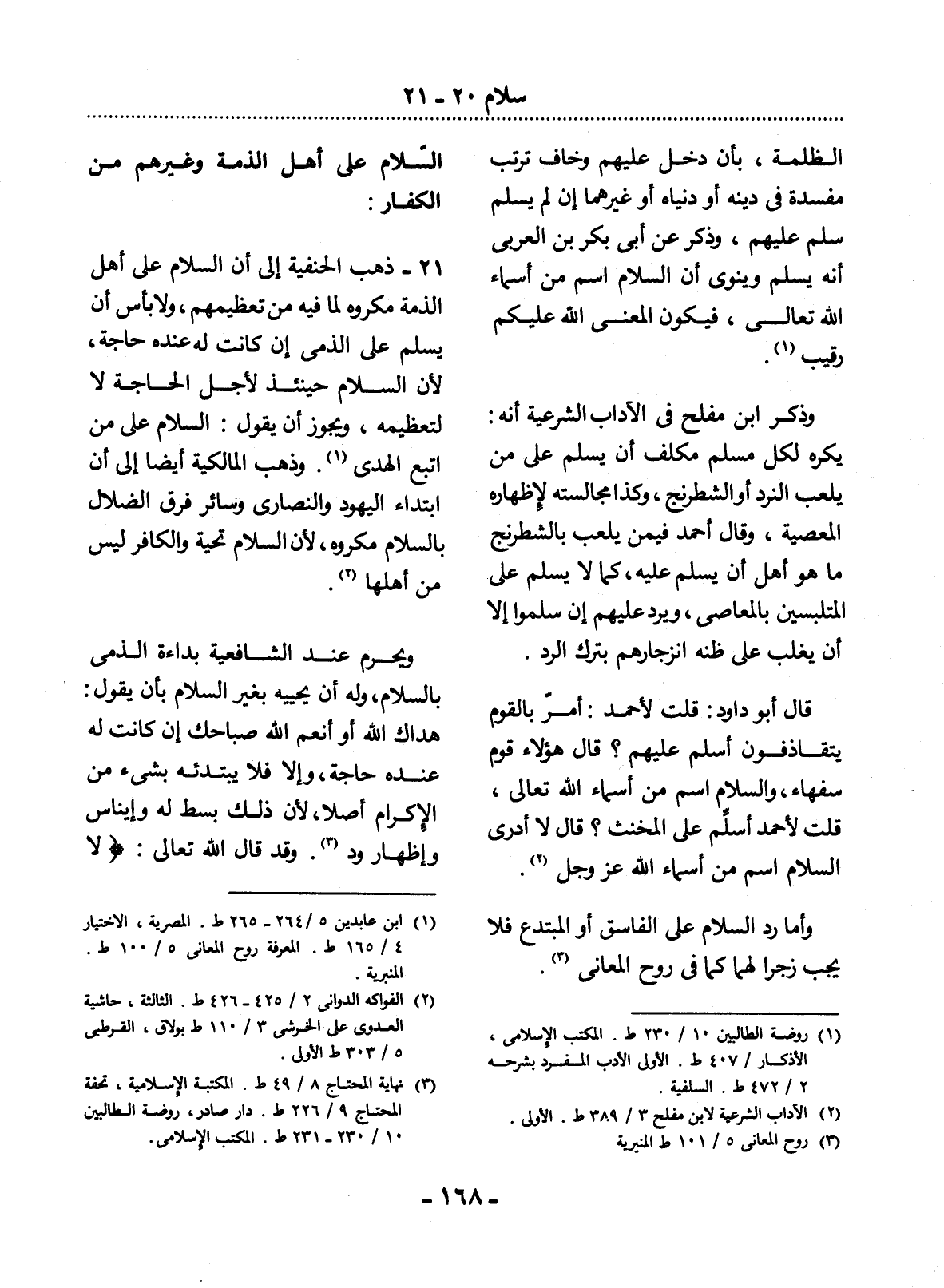 21 - ذَهَبَ الْحَنَفِيَّةُ إِلَى أَنَّ السَّلاَمَ عَلَى أَهْل الذِّمَّةِ مَكْرُوهٌ لِمَا فِيهِ مِنْ تَعْظِيمِهِمْ، وَلاَ بَأْسَ أَنْ يُسَلِّمَ عَلَى الذِّمِّيِّ إِنْ كَانَتْ لَهُ عِنْدَهُ حَاجَةٌ؛ لأَِنَّ السَّلاَمَ حِينَئِذٍ لأَِجْل الْحَاجَةِ لاَ لِتَعْظِيمِهِ، وَيَجُوزُ أَنْ يَقُول: السَّلاَمُ عَلَى مَنِ اتَّبَعَ الْهُدَى (1) . وَذَهَبَ الْمَالِكِيَّةُ أَيْضًا إِلَى أَنَّ ابْتِدَاءَ الْيَهُودِ وَالنَّصَارَى وَسَائِرِ فِرَقِ الضَّلاَل بِالسَّلاَمِ مَكْرُوهٌ؛ لأَِنَّ السَّلاَمَ تَحِيَّةٌ وَالْكَافِرَ لَيْسَ مِنْ أَهْلِهَا (2) .