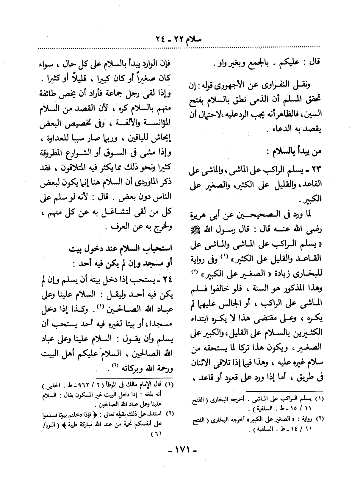 23 - يُسَلِّمُ الرَّاكِبُ عَلَى الْمَاشِي، وَالْمَاشِي عَلَى الْقَاعِدِ، وَالْقَلِيل عَلَى الْكَثِيرِ، وَالصَّغِيرُ عَلَى الْكَبِيرِ.