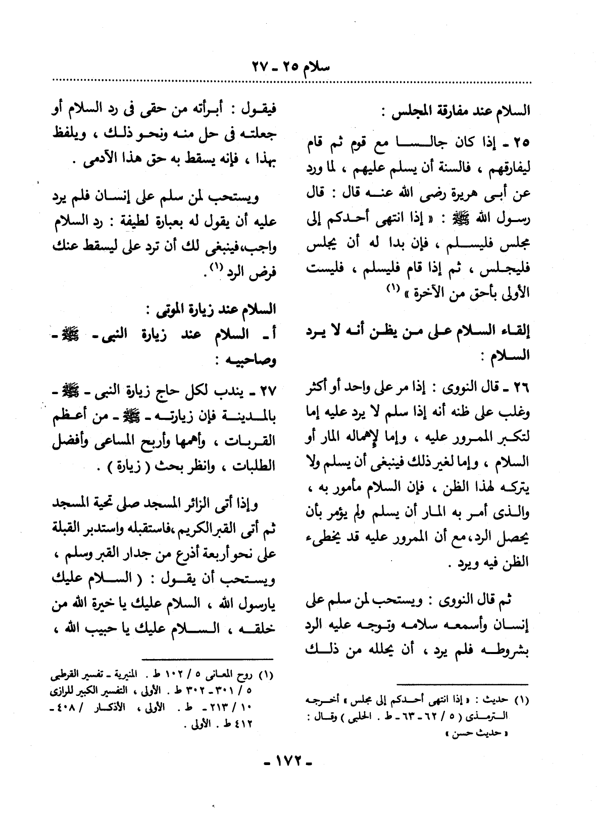 25 - إِذَا كَانَ جَالِسًا مَعَ قَوْمٍ ثُمَّ قَامَ لِيُفَارِقَهُمْ، فَالسُّنَّةُ أَنْ يُسَلِّمَ عَلَيْهِمْ؛ لِمَا وَرَدَ عَنْ أَبِي هُرَيْرَةَ رَضِيَ اللَّهُ عَنْهُ قَال: قَال رَسُول اللَّهِ صَلَّى اللَّهُ عَلَيْهِ وَسَلَّمَ: إِذَا انْتَهَى أَحَدُكُمْ إِلَى مَجْلِسٍ فَلْيُسَلِّمْ، فَإِنْ بَدَا لَهُ أَنْ يَجْلِسَ فَلْيَجْلِسْ، ثُمَّ إِذَا قَامَ فَلْيُسَلِّمْ، فَلَيْسَتْ الأُْولَى بِأَحَقَّ مِنَ الآْخِرَةِ (1)
