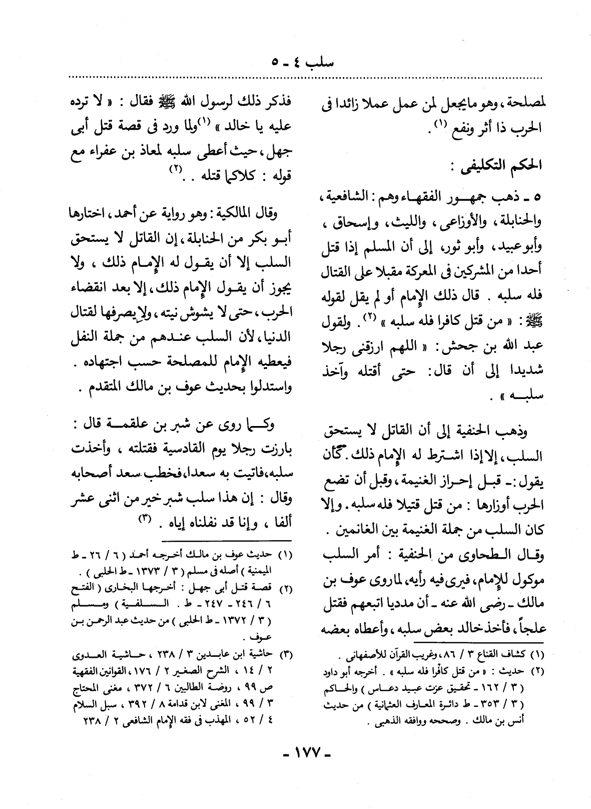فَذَكَرَ ذَلِكَ لِرَسُول اللَّهِ صَلَّى اللَّهُ عَلَيْهِ وَسَلَّمَ فَقَال: لاَ تَرُدُّهُ عَلَيْهِ يَا خَالِدُ (1) وَلِمَا وَرَدَ فِي قِصَّةِ قَتْل أَبِي جَهْلٍ، حَيْثُ أَعْطَى سَلَبُهُ لِمُعَاذِ ابْنِ عَفْرَاءَ مَعَ قَوْلِهِ: كِلاَكُمَا قَتَلَهُ (2) . .