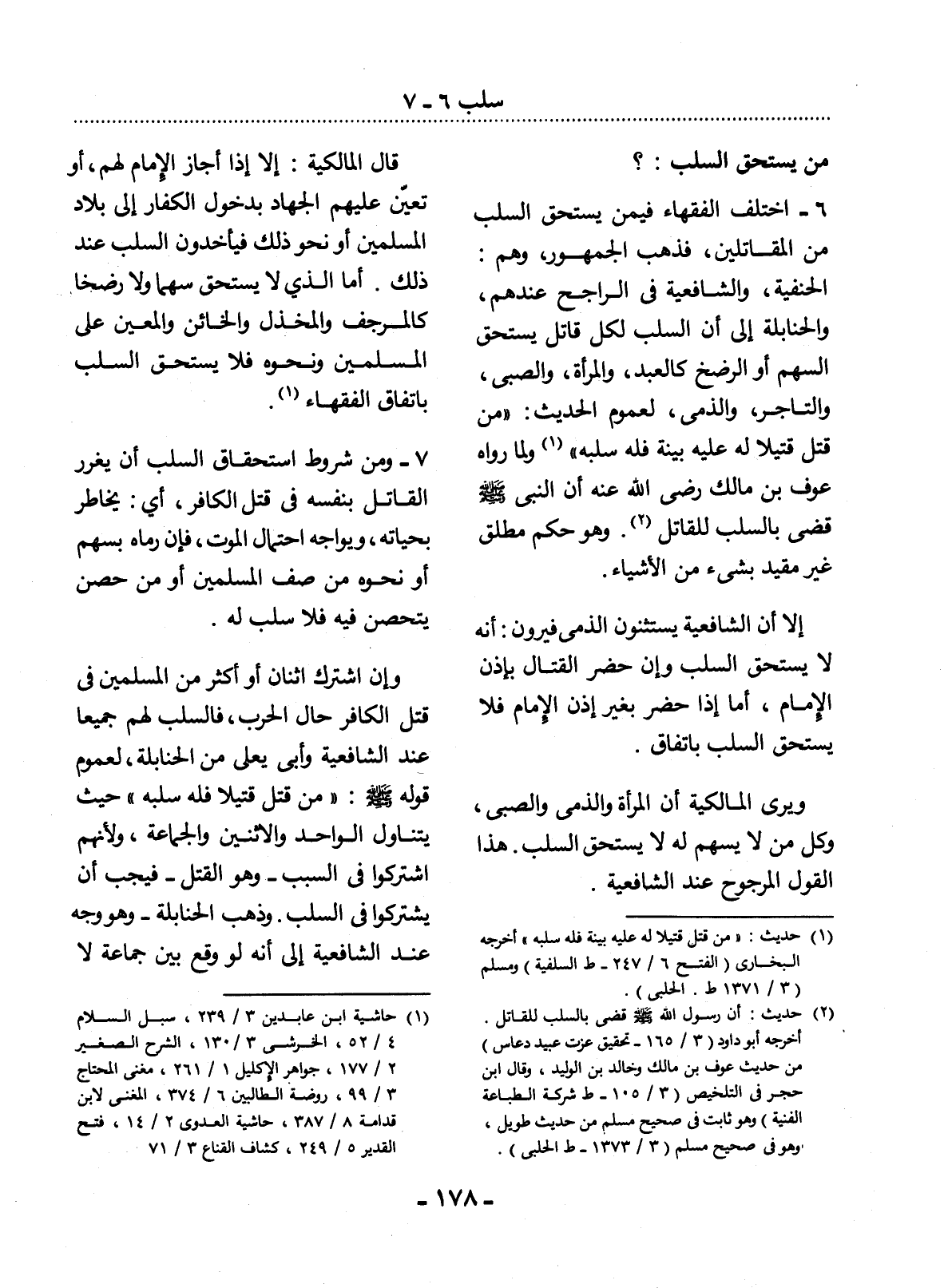 6 - اخْتَلَفَ الْفُقَهَاءُ فِيمَنْ يَسْتَحِقُّ السَّلَبَ مِنَ الْمُقَاتِلِينَ، فَذَهَبَ الْجُمْهُورُ، وَهُمْ الْحَنَفِيَّةُ وَالشَّافِعِيَّةُ فِي الرَّاجِحِ عِنْدَهُمْ، وَالْحَنَابِلَةُ، إِلَى أَنَّ السَّلَبَ لِكُل قَاتِلٍ يَسْتَحِقُّ السَّهْمَ أَوِ الرَّضْخَ كَالْعَبْدِ، وَالْمَرْأَةِ، وَالصَّبِيِّ، وَالتَّاجِرِ، وَالذِّمِّيِّ، لِعُمُومِ الْحَدِيثِ: مَنْ قَتَل قَتِيلاً لَهُ عَلَيْهِ بَيِّنَةٌ فَلَهُ سَلَبُهُ (1) وَلِمَا رَوَاهُ عَوْفُ بْنُ مَالِكٍ رَضِيَ اللَّهُ عَنْهُ أَنَّ النَّبِيَّ صَلَّى اللَّهُ عَلَيْهِ وَسَلَّمَ قَضَى بِالسَّلَبِ لِلْقَاتِل (2) . وَهُوَ حُكْمٌ مُطْلَقٌ غَيْرُ مُقَيَّدٍ بِشَيْءٍ مِنَ الأَْشْيَاءِ.