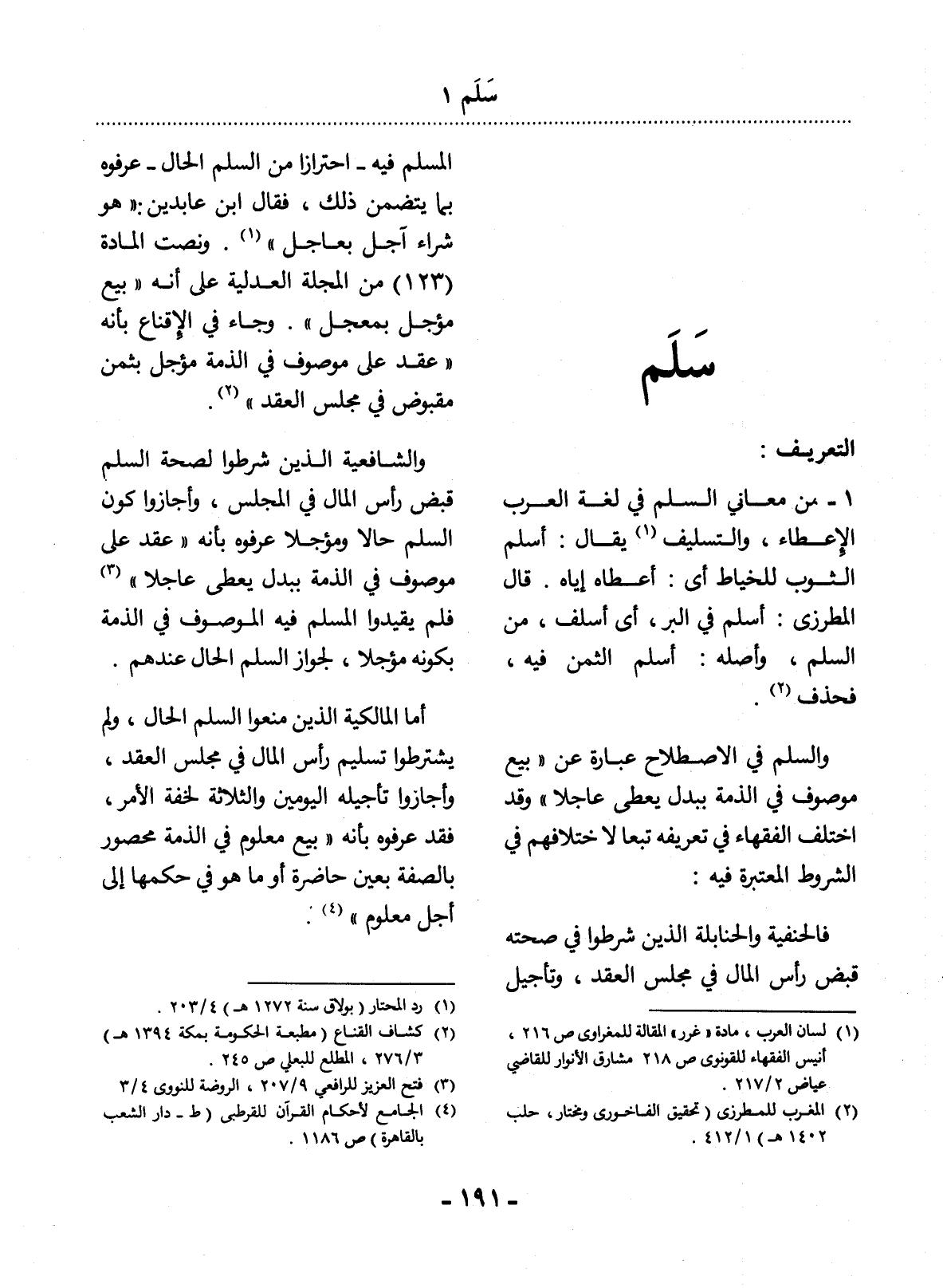 وَالسَّلَمُ فِي الاِصْطِلاَحِ عِبَارَةٌ عَنْ " بَيْعِ مَوْصُوفٍ فِي الذِّمَّةِ بِبَدَلٍ يُعْطَى عَاجِلاً " وَقَدِ اخْتَلَفَ الْفُقَهَاءُ فِي تَعْرِيفِهِ تَبَعًا لاِخْتِلاَفِهِمْ فِي الشُّرُوطِ الْمُعْتَبَرَةِ فِيهِ: