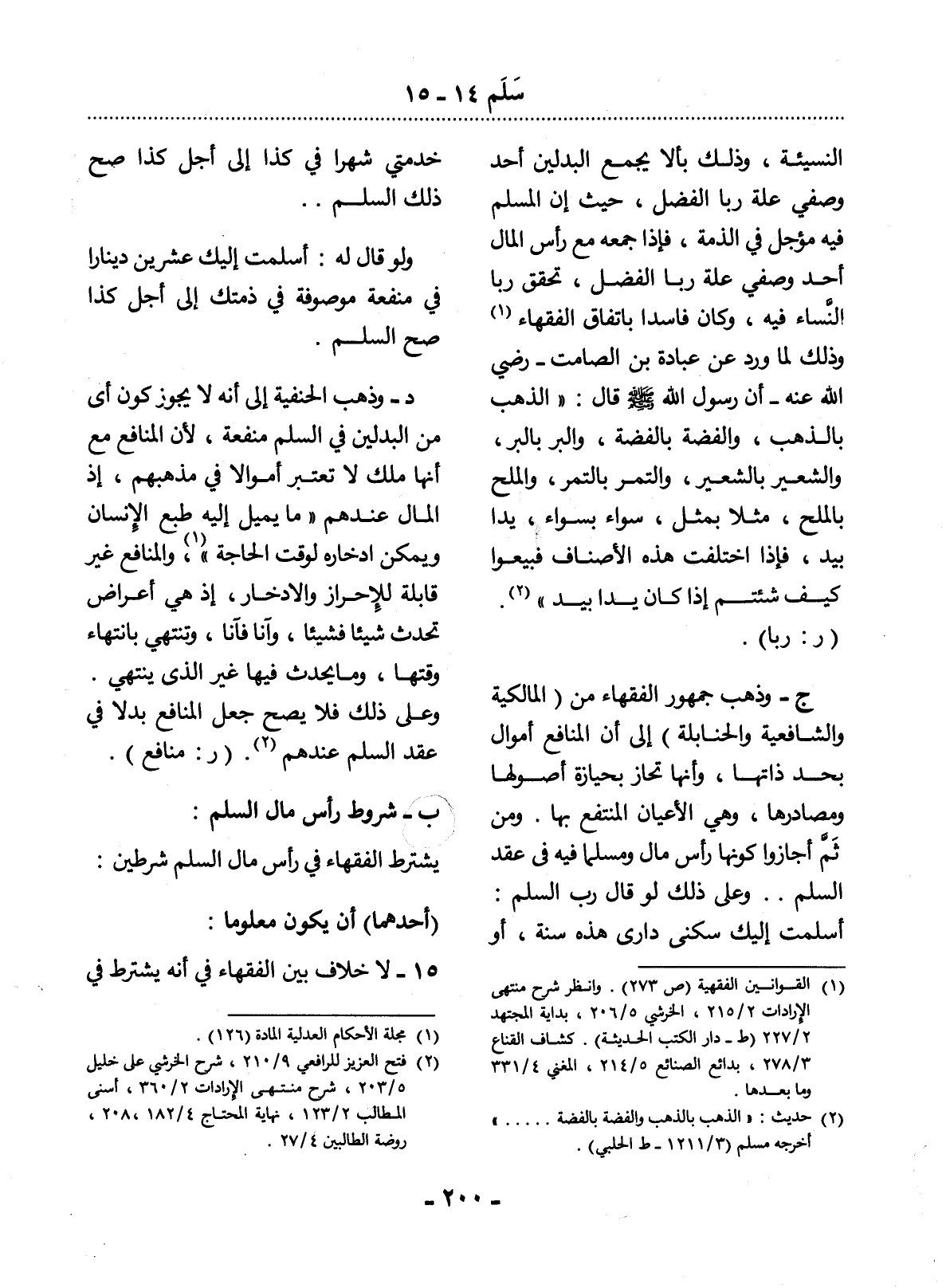 النَّسِيئَةِ، وَذَلِكَ بِأَلاَّ يَجْمَعَ الْبَدَلَيْنِ أَحَدُ وَصْفَيْ عِلَّةِ رِبَا الْفَضْل، حَيْثُ إِنَّ الْمُسْلَمَ فِيهِ مُؤَجَّلٌ فِي الذِّمَّةِ، فَإِذَا جَمَعَهُ مَعَ رَأْسِ الْمَال أَحَدُ وَصْفَيْ عِلَّةِ رِبَا الْفَضْل، تَحَقَّقَ رِبَا النَّسَاءِ فِيهِ، وَكَانَ فَاسِدًا بِاتِّفَاقِ الْفُقَهَاءِ (1) وَذَلِكَ لِمَا وَرَدَ عَنْ عُبَادَةَ بْنِ الصَّامِتِ - رَضِيَ اللَّهُ عَنْهُ - أَنَّ رَسُول اللَّهِ صَلَّى اللَّهُ عَلَيْهِ وَسَلَّمَ قَال: الذَّهَبُ بِالذَّهَبِ، وَالْفِضَّةُ بِالْفِضَّةِ، وَالْبُرُّ بِالْبُرِّ، وَالشَّعِيرُ بِالشَّعِيرِ، وَالتَّمْرُ بِالتَّمْرِ، وَالْمِلْحُ بِالْمِلْحِ، مِثْلاً بِمِثْلٍ، سَوَاءً بِسَوَاءٍ، يَدًا بِيَدٍ، فَإِذَا اخْتَلَفَتْ هَذِهِ الأَْصْنَافُ فَبِيعُوا كَيْفَ شِئْتُمْ إِذَا كَانَ يَدًا بِيَدٍ (2) .
