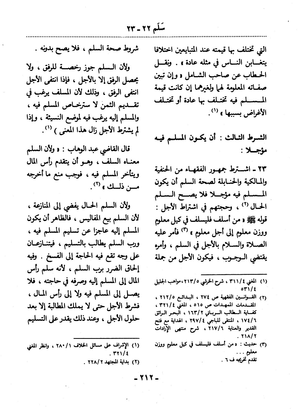 23 - اشْتَرَطَ جُمْهُورُ الْفُقَهَاءِ مِنَ الْحَنَفِيَّةِ وَالْمَالِكِيَّةِ وَالْحَنَابِلَةِ لِصِحَّةِ السَّلَمِ أَنْ يَكُونَ الْمُسْلَمَ فِيهِ مُؤَجَّلاً فَلاَ يَصِحُّ السَّلَمُ الْحَال (2) ، وَحُجَّتُهُمْ فِي اشْتِرَاطِ الأَْجَل: قَوْلُهُ صَلَّى اللَّهُ عَلَيْهِ وَسَلَّمَ مَنْ أَسْلَفَ فَلْيُسْلِفْ فِي كَيْلٍ مَعْلُومٍ وَوَزْنٍ مَعْلُومٍ إِلَى أَجَلٍ مَعْلُومٍ (3) فَأَمَرَ عَلَيْهِ الصَّلَاةُ وَالسَّلَامُ بِالأَْجَل فِي السَّلَمِ، وَأَمْرُهُ يَقْتَضِي الْوُجُوبَ، فَيَكُونُ الأَْجَل مِنْ جُمْلَةِ