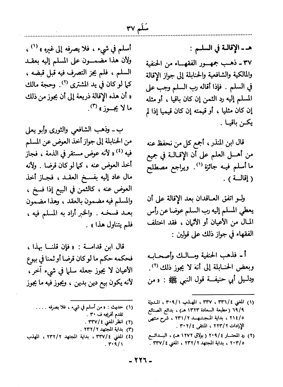 هـ - الإِْقَالَةُ فِي السَّلَمِ: 37 - ذَهَبَ جُمْهُورُ الْفُقَهَاءِ مِنَ الْحَنَفِيَّةِ وَالْمَالِكِيَّةِ وَالشَّافِعِيَّةِ وَالْحَنَابِلَةِ إِلَى جَوَازِ الإِْقَالَةِ فِي السَّلَمِ. فَإِذَا أَقَالَهُ رَبُّ السَّلَمِ وَجَبَ عَلَى الْمُسْلَمِ إِلَيْهِ رَدُّ الثَّمَنِ إِنْ كَانَ بَاقِيًا، أَوْ مِثْلِهِ إِنْ كَانَ مِثْلِيًّا، أَوْ قِيمَتِهِ إِنْ كَانَ قِيمِيًّا إِذَا لَمْ يَكُنْ بَاقِيًا.