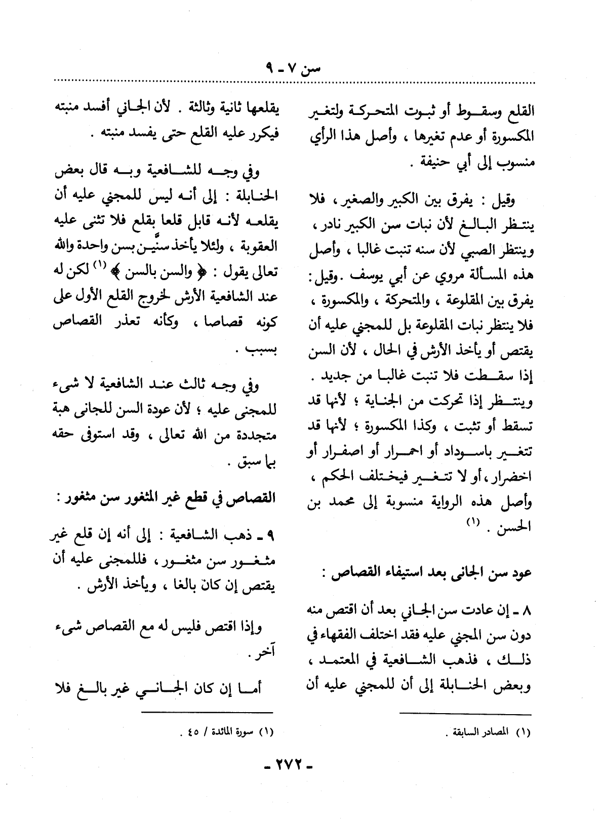 8 - إِنْ عَادَتْ سِنُّ الْجَانِي بَعْدَ أَنِ اقْتُصَّ مِنْهُ دُونَ سِنِّ الْمَجْنِيِّ عَلَيْهِ فَقَدِ اخْتَلَفَ الْفُقَهَاءُ فِي ذَلِكَ، فَذَهَبَ الشَّافِعِيَّةُ فِي الْمُعْتَمَدِ، وَبَعْضُ الْحَنَابِلَةِ إِلَى أَنَّ لِلْمَجْنِيِّ عَلَيْهِ أَنْ