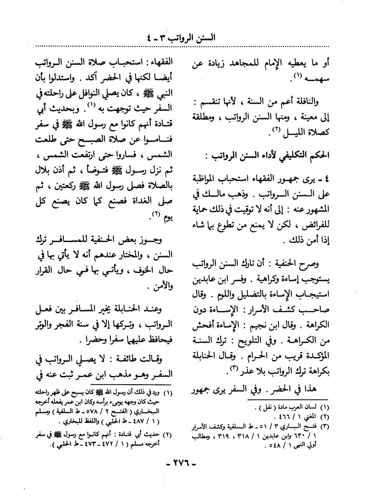 وَصَرَّحَ الْحَنَفِيَّةُ أَنَّ تَارِكَ السُّنَنِ الرَّوَاتِبِ يَسْتَوْجِبُ إِسَاءَةً وَكَرَاهِيَةً. وَفَسَّرَ ابْنُ عَابِدِينَ اسْتِيجَابَ الإِْسَاءَةِ بِالتَّضْلِيل وَاللَّوْمِ. وَقَال صَاحِبُ كَشْفِ الأَْسْرَارِ: الإِْسَاءَةُ دُونَ الْكَرَاهَةِ. وَقَال ابْنُ نُجَيْمٍ: الإِْسَاءَةُ أَفْحَشُ مِنَ الْكَرَاهَةِ. وَفِي التَّلْوِيحِ: تَرْكُ السُّنَّةِ الْمُؤَكَّدَةِ قَرِيبٌ مِنَ الْحَرَامِ. وَقَال الْحَنَابِلَةُ بِكَرَاهَةِ تَرْكِ الرَّوَاتِبِ بِلاَ عُذْرٍ (3) . هَذَا فِي الْحَضَرِ. وَفِي السَّفَرِ يَرَى جُمْهُورُ