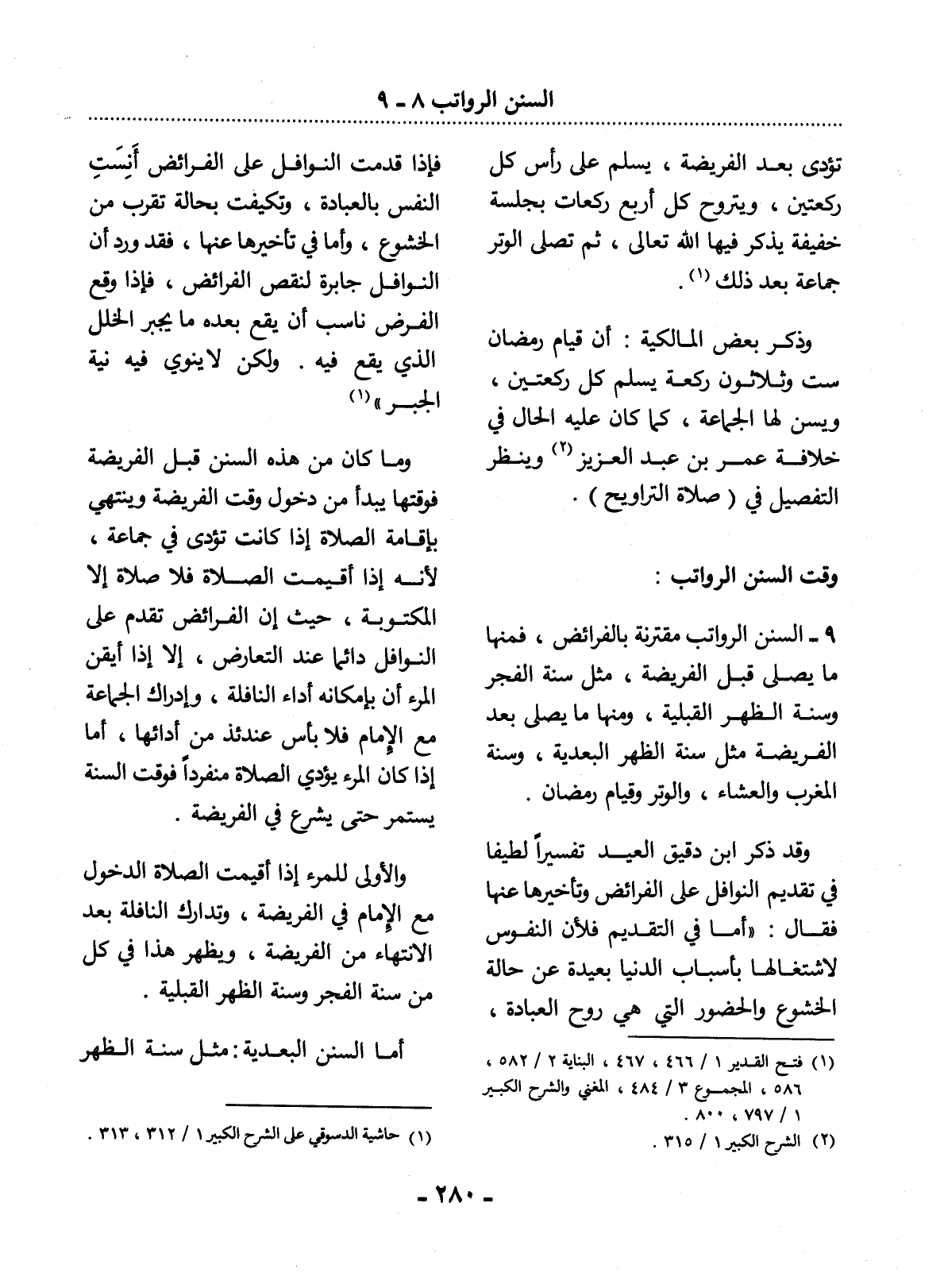 9 - السُّنَنُ الرَّوَاتِبُ مُقْتَرِنَةٌ بِالْفَرَائِضِ، فَمِنْهَا مَا يُصَلَّى قَبْل الْفَرِيضَةِ، مِثْل سُنَّةِ الْفَجْرِ وَسُنَّةِ الظُّهْرِ الْقَبْلِيَّةِ، وَمِنْهَا مَا يُصَلَّى بَعْدَ الْفَرِيضَةِ مِثْل سُنَّةِ الظُّهْرِ الْبَعْدِيَّةِ، وَسُنَّةِ الْمَغْرِبِ وَالْعِشَاءِ، وَالْوِتْرِ وَقِيَامِ رَمَضَانَ.