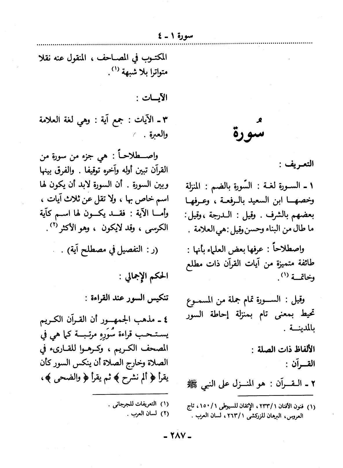 1 - السُّورَةُ لُغَةً: السُّورَةُ بِالضَّمِّ: الْمَنْزِلَةُ، وَخَصَّهَا ابْنُ السَّعِيدِ بِالرِّفْعَةِ، وَعَرَّفَهَا بَعْضُهُمْ بِالشَّرَفِ. وَقِيل: الدَّرَجَةُ، وَقِيل: مَا طَال مِنَ الْبِنَاءِ وَحَسُنَ، وَقِيل: هِيَ الْعَلاَمَةُ.