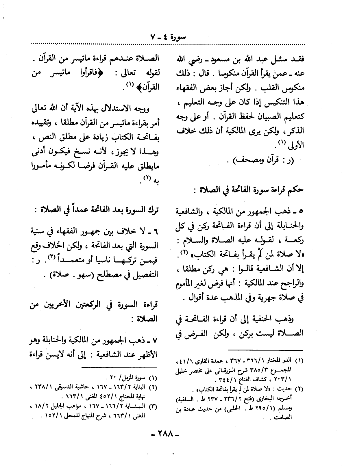 5 - ذَهَبَ الْجُمْهُورُ مِنَ الْمَالِكِيَّةِ، وَالشَّافِعِيَّةِ وَالْحَنَابِلَةِ إِلَى أَنَّ قِرَاءَةَ الْفَاتِحَةِ رُكْنٌ فِي كُل رَكْعَةٍ، لِقَوْلِهِ عَلَيْهِ الصَّلَاةُ وَالسَّلَامُ: لاَ صَلاَةَ لِمَنْ لَمْ يَقْرَأْ بِفَاتِحَةِ الْكِتَابِ. إِلاَّ أَنَّ الشَّافِعِيَّةَ قَالُوا: هِيَ رُكْنٌ مُطْلَقًا، وَالرَّاجِحُ عِنْدَ الْمَالِكِيَّةِ: أَنَّهَا فَرْضٌ لِغَيْرِ الْمَأْمُومِ فِي صَلاَةٍ جَهْرِيَّةٍ وَفِي الْمَذْهَبِ عِدَّةُ أَقْوَالٍ.