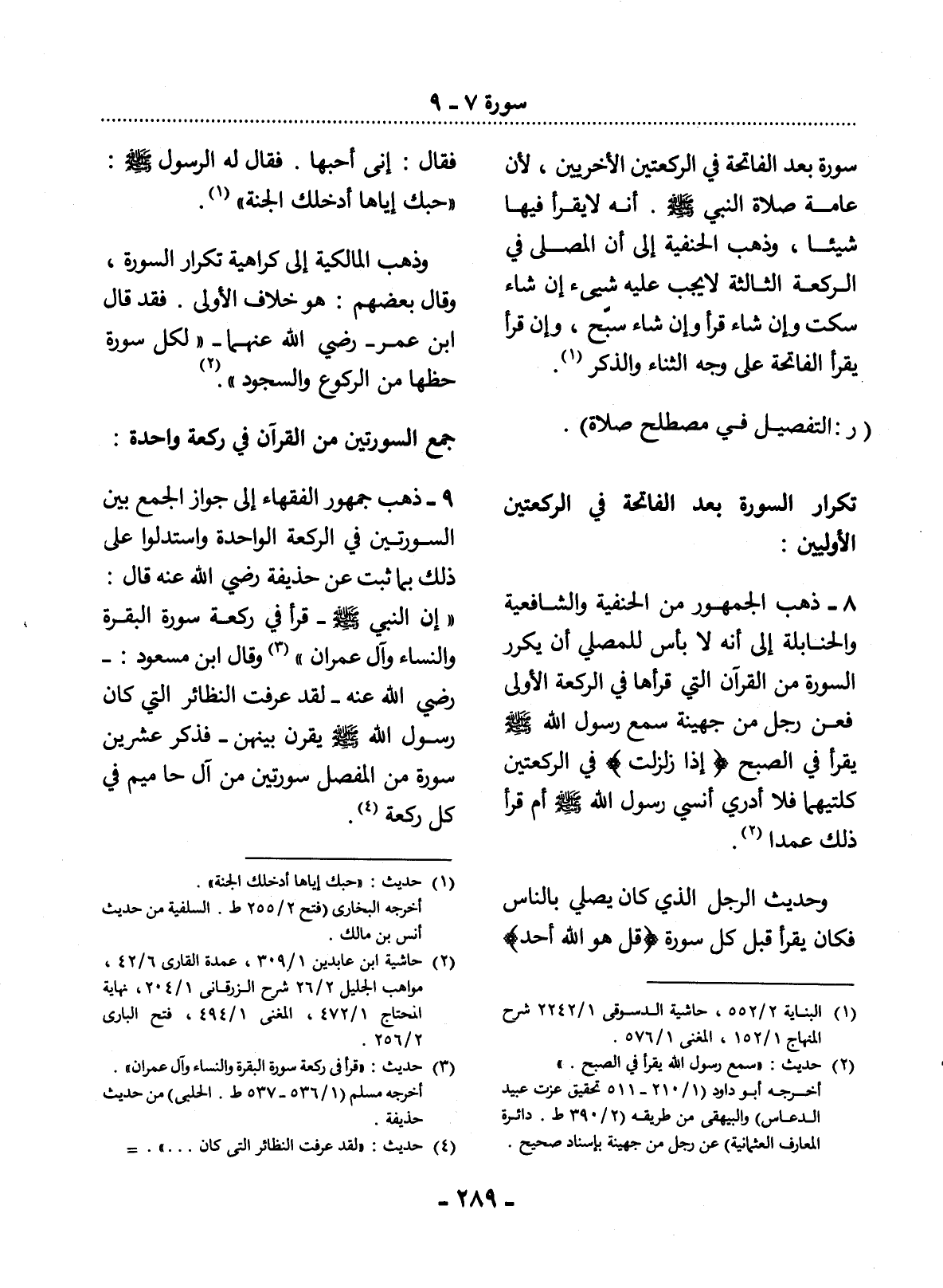9 - ذَهَبَ جُمْهُورُ الْفُقَهَاءِ إِلَى جَوَازِ الْجَمْعِ بَيْنَ السُّورَتَيْنِ فِي الرَّكْعَةِ الْوَاحِدَةِ وَاسْتَدَلُّوا عَلَى ذَلِكَ بِمَا ثَبَتَ عَنْ حُذَيْفَةَ رَضِيَ اللَّهُ عَنْهُ قَال: إِنَّ النَّبِيَّ صَلَّى اللَّهُ عَلَيْهِ وَسَلَّمَ - قَرَأَ فِي رَكْعَةٍ سُورَةَ الْبَقَرَةِ وَالنِّسَاءِ وَآل عِمْرَانَ وَقَال ابْنُ مَسْعُودٍ: - رَضِيَ اللَّهُ عَنْهُ - لَقَدْ عَرَفْتُ النَّظَائِرَ الَّتِي كَانَ رَسُول اللَّهِ صَلَّى اللَّهُ عَلَيْهِ وَسَلَّمَ يَقْرِنُ بَيْنَهُنَّ - فَذَكَرَ عِشْرِينَ سُورَةً مِنَ الْمُفَصَّل، سُورَتَيْنِ مِنْ آل حَامِيمَ فِي كُل رَكْعَةٍ.