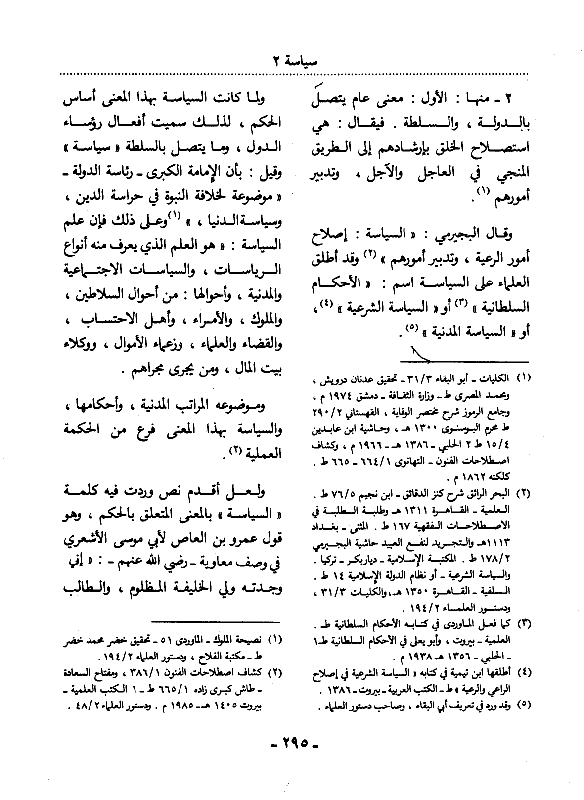 (2) البحر الرائق شرح كنز الدقائق - ابن نجيم 5 / 76 ط. العلمية - القاهرة 1311 هـ وطلبة الطلبة في الاصطلاحات الفقهية 167ط. المثنى - بغداد 1113 هـ والتجريد لنفع العبيد حاشية البجيرمي 2 / 178 ط. المكتبة الإسلامية - ديار بكر - تركيا. والسياسة الشرعية - أو نظام الدولة الإسلامية 14ط. السلفية - القاهرة 1350 هـ، والكليات 3 / 31، ودستور العلماء 2 / 194.
