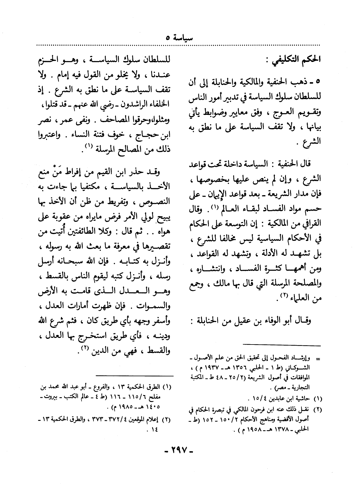 5 - ذَهَبَ الْحَنَفِيَّةُ وَالْمَالِكِيَّةُ وَالْحَنَابِلَةُ إِلَى أَنَّ لِلسُّلْطَانِ سُلُوكَ السِّيَاسَةِ فِي تَدْبِيرِ أُمُورِ النَّاسِ وَتَقْوِيمِ الْعِوَجِ، وَفْقَ مَعَايِيرَ وَضَوَابِطَ يَأْتِي بَيَانُهَا، وَلاَ تَقِفُ السِّيَاسَةُ عَلَى مَا نَطَقَ بِهِ الشَّرْعُ.