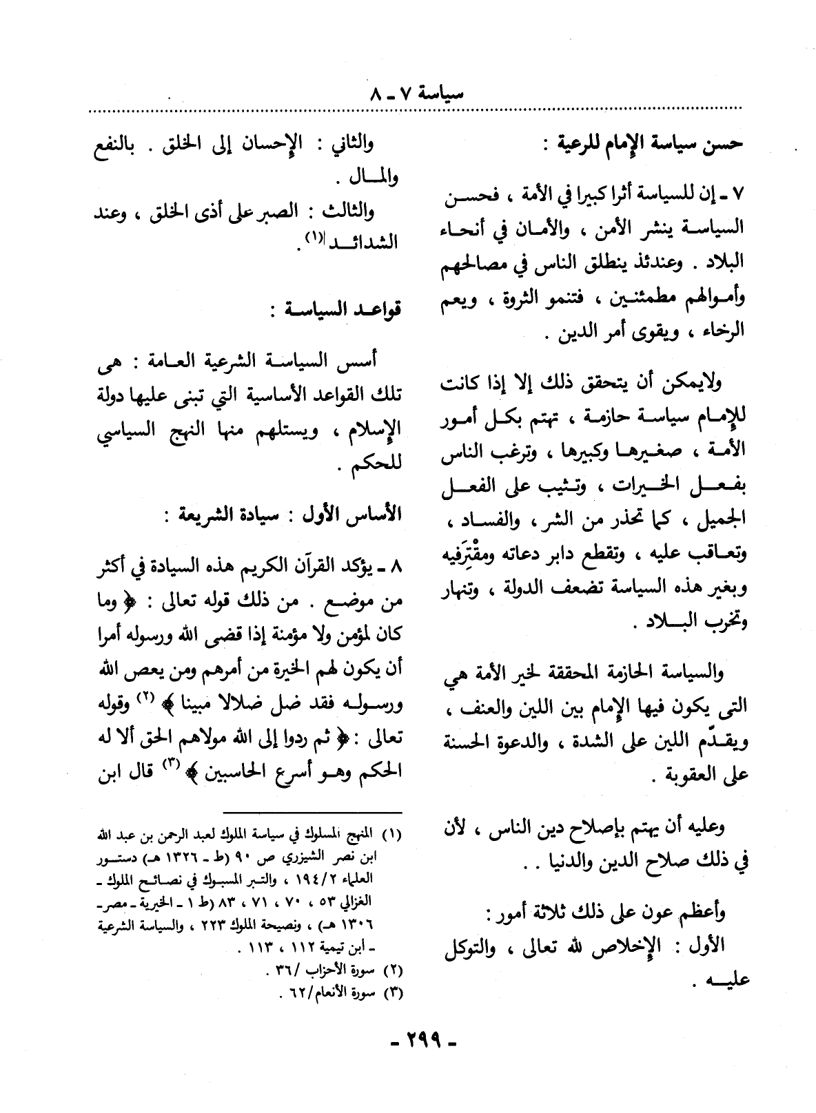 (1) المنهج المسلوك في سياسة الملوك لعبد الرحمن بن عبد الله بن نصر الشيزري ص 90 (ط - 1326 هـ) دستور العلماء 2 / 194، والتبر المسبوك في نصائح الملوك - الغزالي 53، 70، 71، 83 (ط1 - الخيرية - مصر - 1306 هـ) ، ونصيحة الملوك 223، والسياسة الشرعية - ابن تيمية 112، 113.