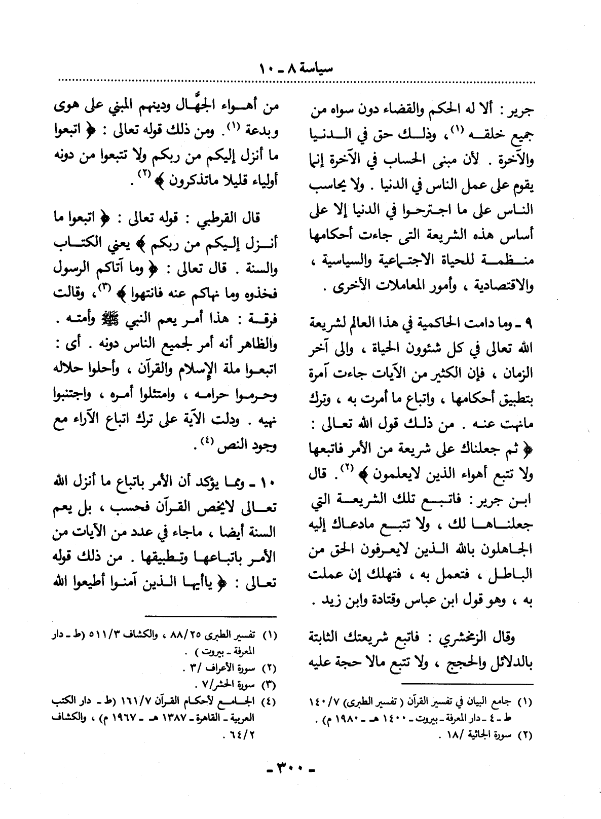 9 - وَمَا دَامَتِ الْحَاكِمِيَّةُ فِي هَذَا الْعَالَمِ لِشَرِيعَةِ اللَّهِ تَعَالَى فِي كُل شُؤُونِ الْحَيَاةِ وَإِلَى آخِرِ الزَّمَانِ، فَإِنَّ الْكَثِيرَ مِنَ الآْيَاتِ جَاءَتْ آمِرَةً بِتَطْبِيقِ أَحْكَامِهَا وَاتِّبَاعِ مَا أَمَرَتْ بِهِ وَتَرْكِ مَا نَهَتْ عَنْهُ. مِنْ ذَلِكَ قَوْل اللَّهِ تَعَالَى: {ثُمَّ جَعَلْنَاكَ عَلَى شَرِيعَةٍ مِنَ الأَْمْرِ فَاتَّبِعْهَا وَلاَ تَتَّبِعْ أَهْوَاءَ الَّذِينَ لاَ يَعْلَمُونَ} (2) . قَال ابْنُ جَرِيرٍ: فَاتَّبِعْ تِلْكَ الشَّرِيعَةَ الَّتِي جَعَلْنَاهَا لَكَ، وَلاَ تَتَّبِعْ مَا دَعَاكَ إِلَيْهِ الْجَاهِلُونَ بِاَللَّهِ الَّذِينَ لاَ يَعْرِفُونَ الْحَقَّ مِنَ الْبَاطِل، فَتَعْمَل بِهِ فَتَهْلِكُ إِنْ عَمِلْتَ بِهِ، وَهُوَ قَوْل ابْنِ عَبَّاسٍ وَقَتَادَةَ وَابْنِ زَيْدٍ.