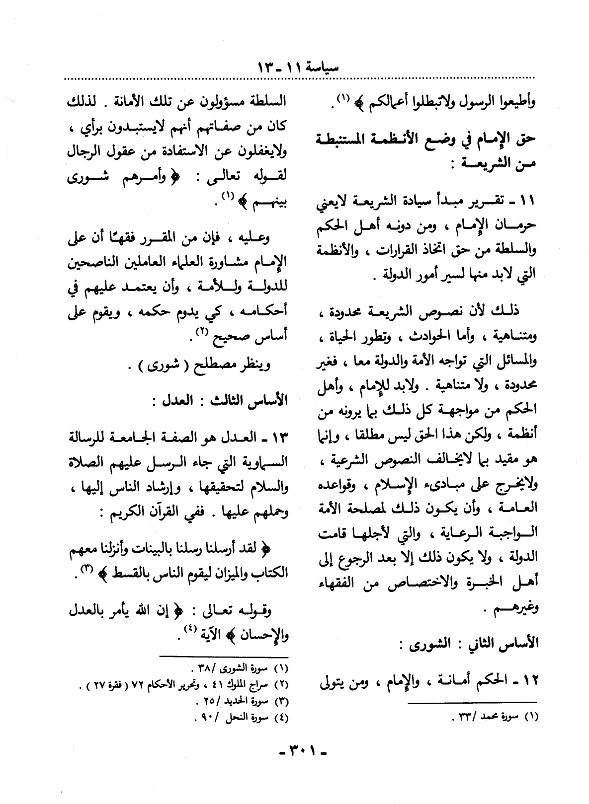 11 - تَقْرِيرُ مَبْدَأِ سِيَادَةِ الشَّرِيعَةِ لاَ يَعْنِي حِرْمَانَ الإِْمَامِ وَمِنْ دُونِهِ أَهْل الْحُكْمِ وَالسُّلْطَةِ مِنْ حَقِّ اتِّخَاذِ الْقَرَارَاتِ وَالأَْنْظِمَةِ الَّتِي لاَ بُدَّ مِنْهَا لِسَيْرِ أُمُورِ الدَّوْلَةِ.