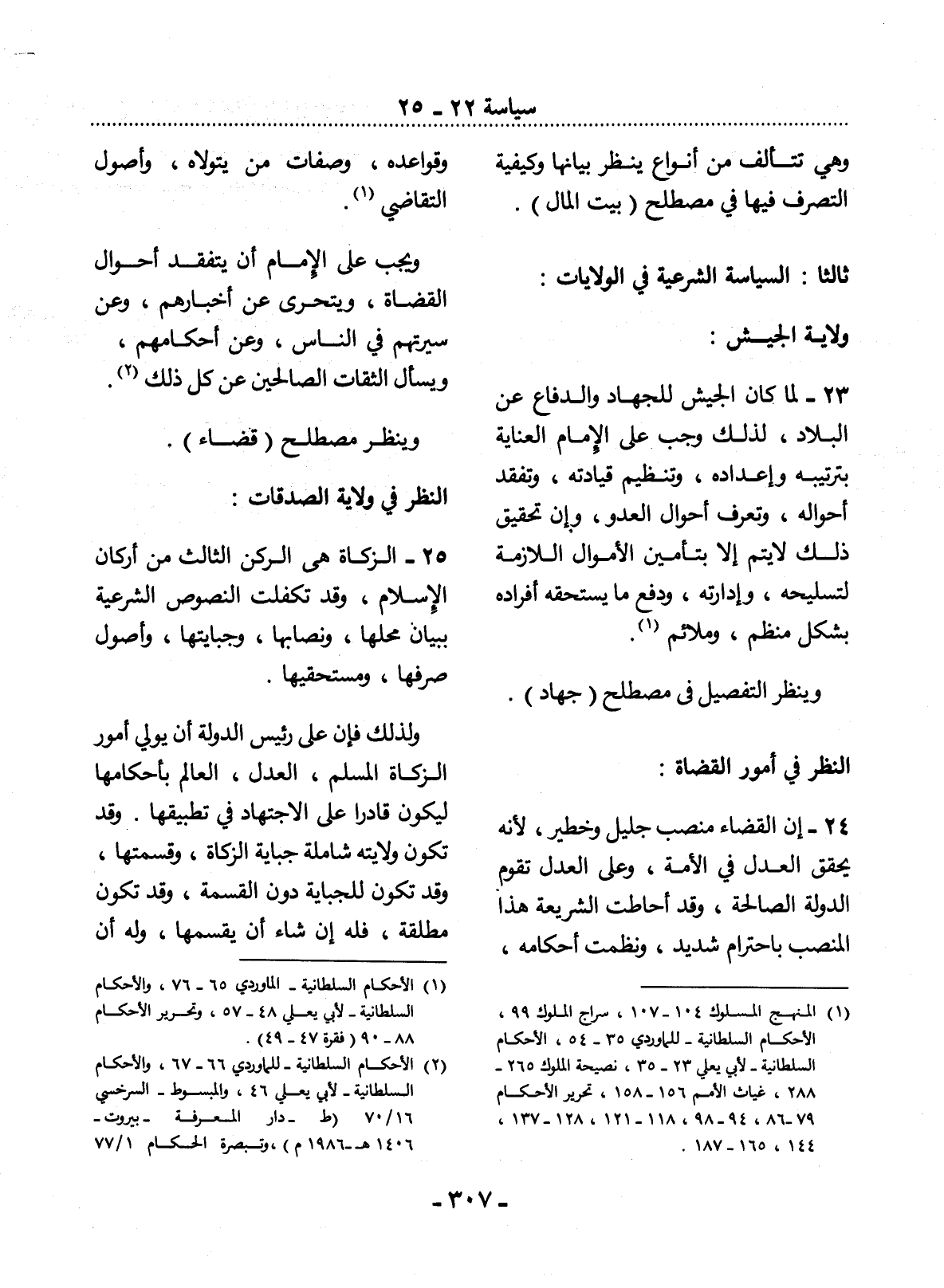 (1) المنهج المسلوك 104 - 107، سراج الملوك 99، الأحكام السلطانية - للماوردي 35 - 54، الأحكام السلطانية - لأبي يعلى 23 - 35، نصيحة الملوك 265 - 288ـ غياث الأمم 156 - 158، تحرير الأحكام 79 - 86، 94 - 98، 118 - 121، 128 - 137، 144، 165 - 187.