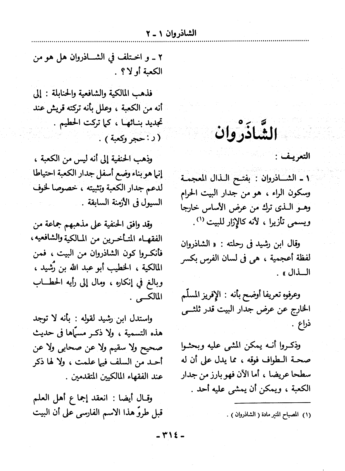 1 - الشَّاذَرْوَانُ: بِفَتْحِ الذَّال الْمُعْجَمَةِ وَسُكُونِ الرَّاءِ، هُوَ مِنْ جِدَارِ الْبَيْتِ الْحَرَامِ وَهُوَ الَّذِي تُرِكَ مِنْ عَرْضِ الأَْسَاسِ خَارِجًا وَيُسَمَّى تَأْزِيرًا، لأَِنَّهُ كَالإِْزَارِ لِلْبَيْتِ (1) .