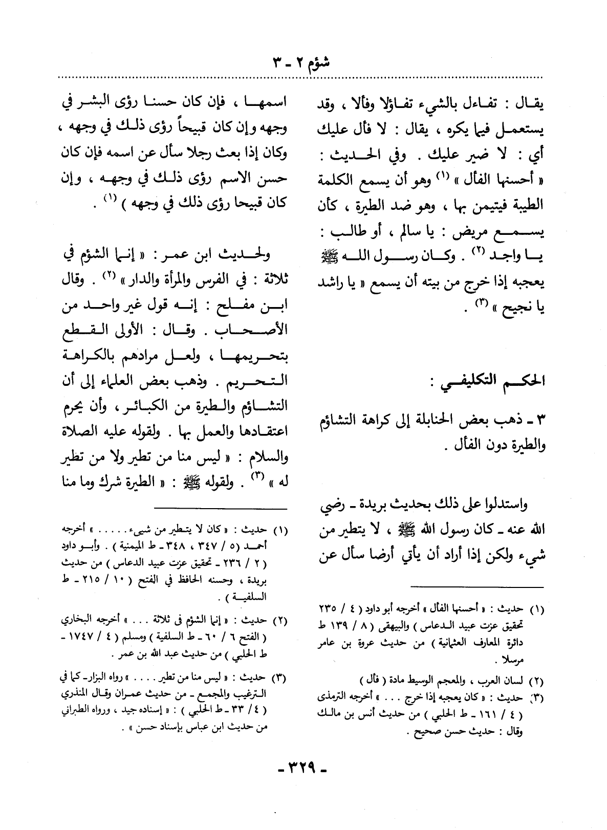 (1) حديث: " كان لا يتطير من شيء. . . ". أخرجه أحمد (5 / 347 - 348 - ط الميمنية) . وأبو داود (2 / 236 - تحقيق عزت عبيد الدعاس) من حديث بريدة، وحسنه الحافظ في الفتح (10 / 215 - ط السلفية) .
