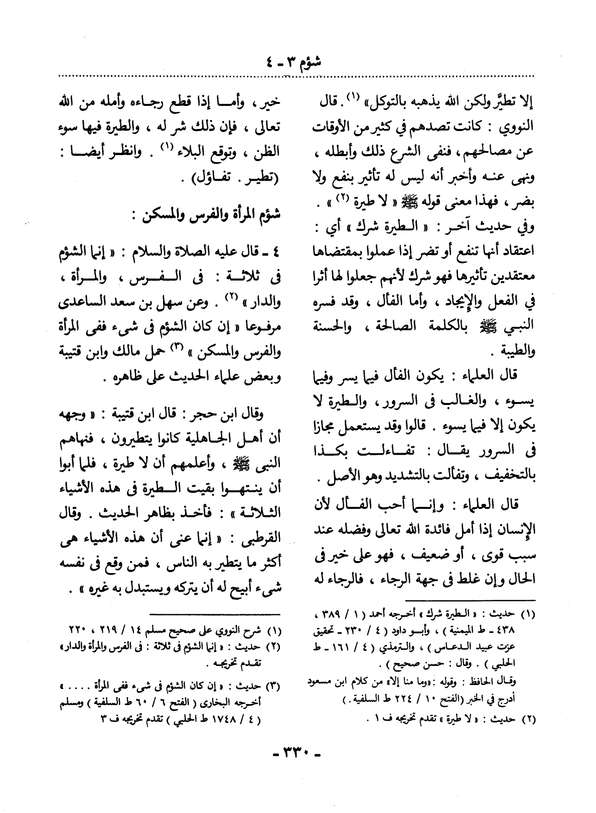 4 - قَال عَلَيْهِ الصَّلَاةُ وَالسَّلَامُ: إِنَّمَا الشُّؤْمُ فِي ثَلاَثَةٍ: فِي الْفَرَسِ، وَالْمَرْأَةِ، وَالدَّارِ (2) . وَعَنْ سَهْل بْنِ سَعْدٍ السَّاعِدِيِّ مَرْفُوعًا إِنْ كَانَ الشُّؤْمُ فِي شَيْءٍ فَفِي الْمَرْأَةِ وَالْفَرَسِ وَالْمَسْكَنِ (3) حَمَل مَالِكٌ وَابْنُ قُتَيْبَةَ وَبَعْضُ عُلَمَاءِ الْحَدِيثِ عَلَى ظَاهِرِهِ.