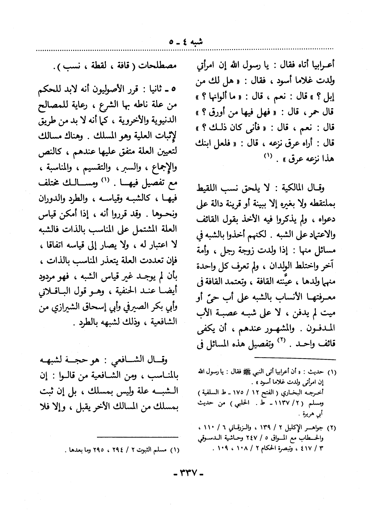 5 - ثَانِيًا: قَرَّرَ الأُْصُولِيُّونَ أَنَّهُ لاَ بُدَّ لِلْحُكْمِ مِنْ عِلَّةٍ نَاطَهُ بِهَا الشَّرْعُ، رِعَايَةً لِلْمَصَالِحِ الدُّنْيَوِيَّةِ وَالأُْخْرَوِيَّةِ، كَمَا أَنَّهُ لاَ بُدَّ مِنْ طَرِيقٍ لإِِثْبَاتِ الْعِلِّيَّةِ وَهُوَ الْمَسْلَكُ. وَهُنَاكَ مَسَالِكُ لِتَعْيِينِ الْعِلَّةِ مُتَّفَقٌ عَلَيْهَا عِنْدَهُمْ، كَالنَّصِّ وَالإِْجْمَاعِ، وَالسَّبْرِ، وَالتَّقْسِيمِ، وَالْمُنَاسَبَةِ، مَعَ تَفْصِيلٍ فِيهَا (1) . وَمَسَالِكُ مُخْتَلَفٌ فِيهَا، كَالشَّبَهِ وَقِيَاسِهِ، وَالطَّرْدِ وَالدَّوَرَانِ وَنَحْوِهَا. وَقَدْ قَرَّرُوا أَنَّهُ إِذَا أَمْكَنَ قِيَاسُ الْعِلَّةِ الْمُشْتَمِل عَلَى الْمُنَاسِبِ بِالذَّاتِ فَالشَّبَهُ لاَ اعْتِبَارَ لَهُ، وَلاَ يُصَارُ إِلَى قِيَاسِهِ اتِّفَاقًا، فَإِنْ تَعَدَّدَتِ الْعِلَّةُ يَتَعَذَّرُ الْمُنَاسِبُ بِالذَّاتِ، بِأَنْ لَمْ يُوجَدْ غَيْرُ قِيَاسِ الشَّبَهِ، فَهُوَ مَرْدُودٌ أَيْضًا عِنْدَ الْحَنَفِيَّةِ، وَهُوَ قَوْل الْبَاقِلاَّنِيِّ وَأَبِي بَكْرٍ الصَّيْرَفِيِّ وَأَبِي إِسْحَاقَ الشِّيرَازِيِّ مِنَ الشَّافِعِيَّةِ، وَذَلِكَ لِشَبَهِهِ بِالطَّرْدِ.