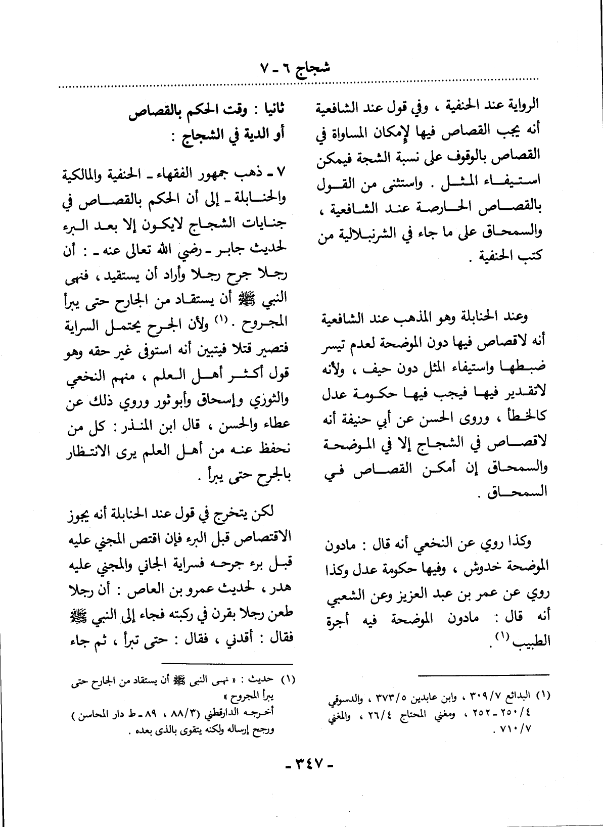 7 - ذَهَبَ جُمْهُورُ الْفُقَهَاءِ - الْحَنَفِيَّةُ وَالْمَالِكِيَّةُ وَالْحَنَابِلَةُ - إِلَى أَنَّ الْحُكْمَ بِالْقِصَاصِ فِي جِنَايَاتِ الشِّجَاجِ لاَ يَكُونُ إِلاَّ بَعْدَ الْبُرْءِ لِحَدِيثِ جَابِرٍ - رَضِيَ اللَّهُ عَنْهُ -: أَنَّ رَجُلاً جَرَحَ رَجُلاً وَأَرَادَ أَنْ يَسْتَقِيدَ، فَنَهَى النَّبِيُّ صَلَّى اللَّهُ عَلَيْهِ وَسَلَّمَ أَنْ يُسْتَقَادَ مِنَ الْجَارِحِ حَتَّى يَبْرَأَ الْمَجْرُوحُ (1) . وَلأَِنَّ الْجُرْحَ يَحْتَمِل السِّرَايَةَ فَتَصِيرُ قَتْلاً فَيَتَبَيَّنُ أَنَّهُ اسْتَوْفَى غَيْرَ حَقِّهِ وَهُوَ قَوْل أَكْثَرِ أَهْل الْعِلْمِ، مِنْهُمْ النَّخَعِيُّ وَالثَّوْرِيُّ وَإِسْحَاقُ وَأَبُو ثَوْرٍ وَرُوِيَ ذَلِكَ عَنْ عَطَاءٍ وَالْحَسَنِ، قَال ابْنُ الْمُنْذِرِ: كُل مَنْ نَحْفَظُ عَنْهُ مِنْ أَهْل الْعِلْمِ يَرَى الاِنْتِظَارَ بِالْجُرْحِ حَتَّى يَبْرَأَ.
