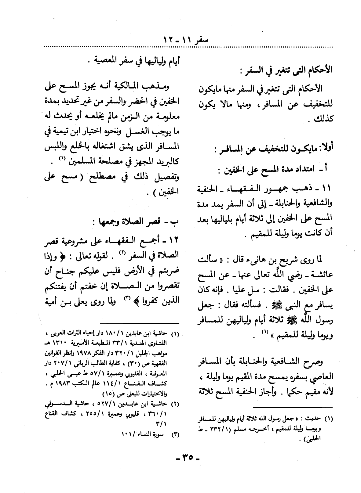 11 - ذَهَبَ جُمْهُورُ الْفُقَهَاءِ - الْحَنَفِيَّةُ وَالشَّافِعِيَّةُ وَالْحَنَابِلَةُ - إِلَى أَنَّ السَّفَرَ يَمُدُّ مُدَّةَ الْمَسْحِ عَلَى الْخُفَّيْنِ إِلَى ثَلاَثَةِ أَيَّامٍ بِلَيَالِيِهَا بَعْدَ أَنْ كَانَتْ يَوْمًا وَلَيْلَةً لِلْمُقِيمِ.