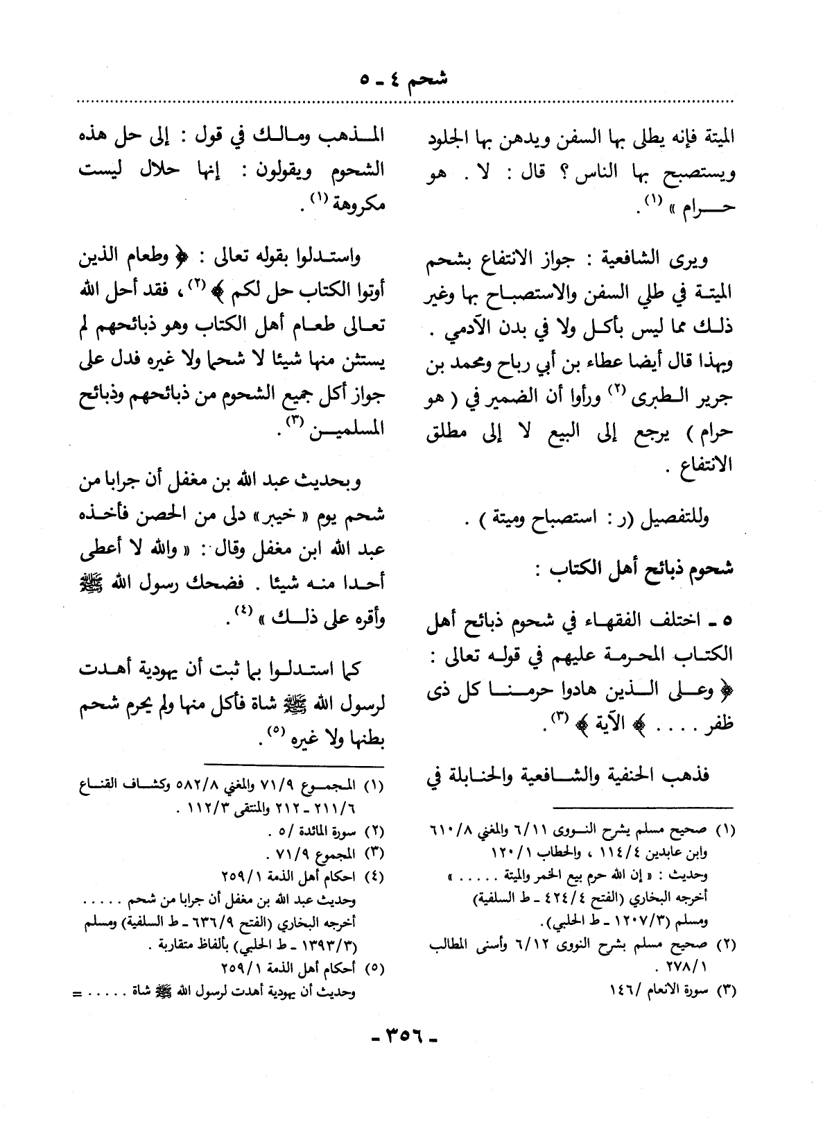 (4) أحكام أهل الذمة 1 / 259. وحديث عبد الله بن مغفل أن جرابا من شحم. . أخرجه البخاري (الفتح 9 / 636 - ط السلفية) ومسلم (3 / 1393 - ط الحلبي) بألفاظ متقاربة.
