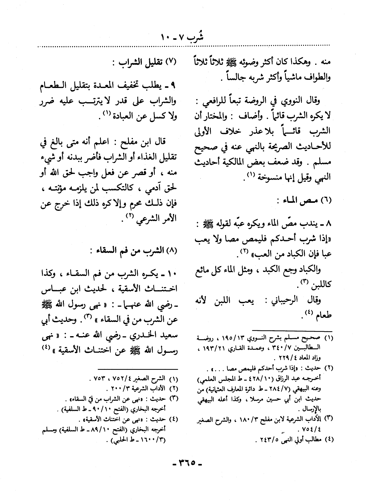 8 - يُنْدَبُ مَصُّ الْمَاءِ وَيُكْرَهُ عَبُّهُ لِقَوْلِهِ صَلَّى اللَّهُ عَلَيْهِ وَسَلَّمَ: إِذَا شَرِبَ أَحَدُكُمْ فَلْيَمُصَّ مَصًّا وَلاَ يَعُبُّ عَبًّا فَإِنَّ الْكُبَادَ مِنَ الْعَبِّ (2) .