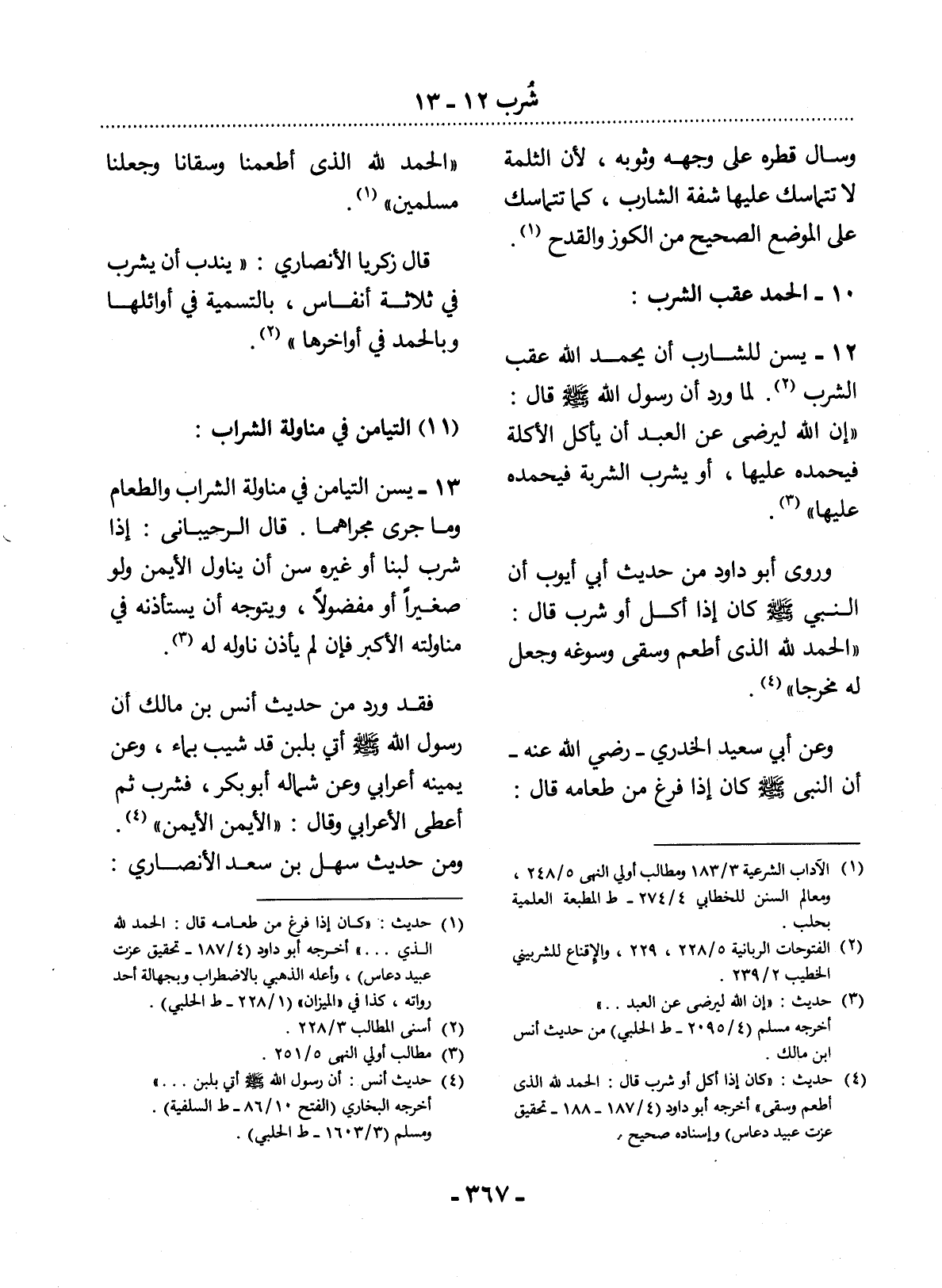12 - يُسَنُّ لِلشَّارِبِ أَنْ يَحْمَدَ اللَّهَ عَقِبَ الشُّرْبِ (2) ؛ لِمَا وَرَدَ أَنَّ رَسُول اللَّهِ صَلَّى اللَّهُ عَلَيْهِ وَسَلَّمَ قَال: إِنَّ اللَّهَ لَيَرْضَى عَنِ الْعَبْدِ أَنْ يَأْكُل الأَْكْلَةَ فَيَحْمَدَهُ عَلَيْهَا، أَوْ يَشْرَبَ الشَّرْبَةَ فَيَحْمَدَهُ عَلَيْهَا (3) .