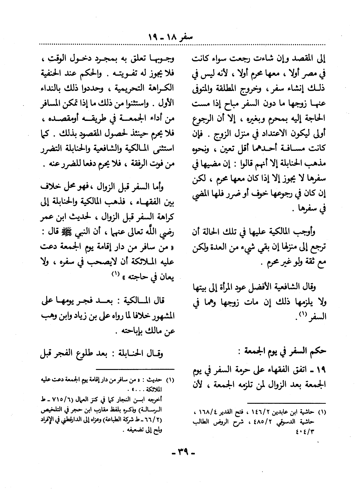 19 - اتَّفَقَ الْفُقَهَاءُ عَلَى حُرْمَةِ السَّفَرِ فِي يَوْمِ الْجُمُعَةِ بَعْدَ الزَّوَال لِمَنْ تَلْزَمُهُ الْجُمُعَةُ؛ لأَِنَّ