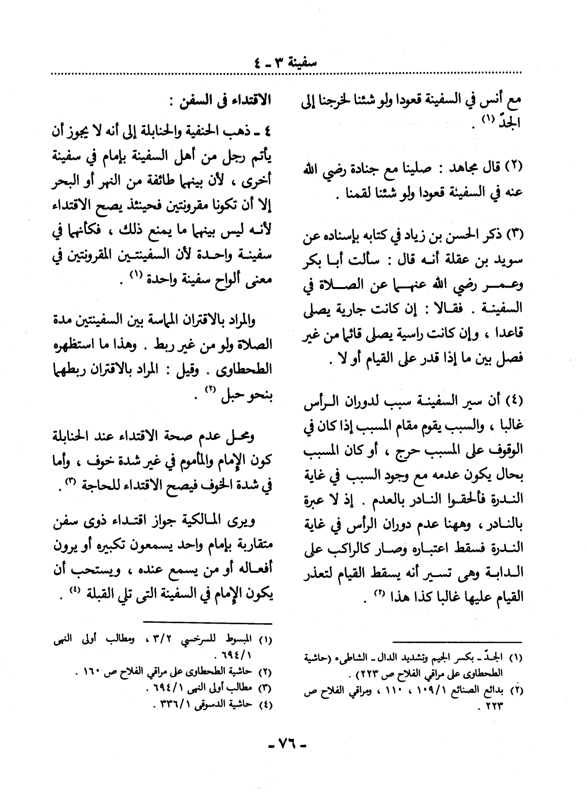 (3) ذَكَرَ الْحَسَنُ بْنُ زِيَادٍ فِي كِتَابِهِ بِإِسْنَادِهِ عَنْ سُوَيْدِ بْنِ عُقْلَةَ أَنَّهُ قَال: سَأَلْتُ أَبَا بَكْرٍ وَعُمَرَ رَضِيَ اللَّهُ عَنْهُمَا عَنِ الصَّلاَةِ فِي السَّفِينَةِ. فَقَالاَ: إِنْ كَانَتْ جَارِيَةً يُصَلِّي قَاعِدًا، وَإِنْ كَانَتْ رَاسِيَةً يُصَلِّي قَائِمًا. مِنْ غَيْرِ فَصْلٍ بَيْنَ مَا إِذَا قَدَرَ عَلَى الْقِيَامِ أَوْ لاَ.