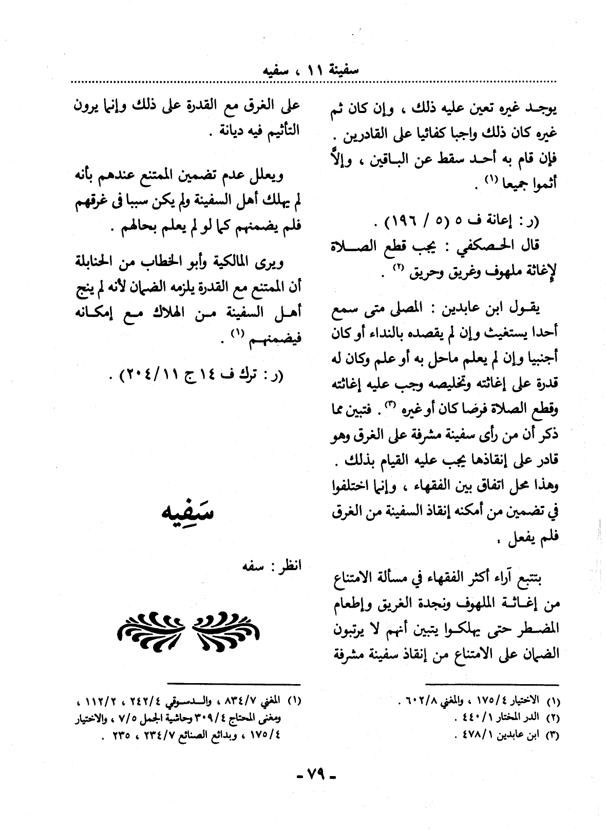 يَقُول ابْنُ عَابِدِينَ: الْمُصَلِّي مَتَى سَمِعَ أَحَدًا يَسْتَغِيثُ وَإِنْ لَمْ يَقْصِدْهُ بِالنِّدَاءِ أَوْ كَانَ أَجْنَبِيًّا، وَإِنْ لَمْ يَعْلَمْ مَا حَل بِهِ، أَوْ عَلِمَ وَكَانَ لَهُ قُدْرَةٌ عَلَى إغَاثَتِهِ وَتَخْلِيصِهِ - وَجَبَ عَلَيْهِ إغَاثَتُهُ وَقَطْعُ الصَّلاَةِ، فَرْضًا كَانَ أَوْ غَيْرَهُ (3) . فَتَبَيَّنَ مِمَّا ذُكِرَ أَنَّ مَنْ رَأَى سَفِينَةً مُشْرِفَةً عَلَى الْغَرَقِ وَهُوَ قَادِرٌ عَلَى إِنْقَاذِهَا يَجِبُ عَلَيْهِ الْقِيَامُ بِذَلِكَ. وَهَذَا مَحَل اتِّفَاقٍ بَيْنَ الْفُقَهَاءِ، وَإِنَّمَا اخْتَلَفُوا فِي تَضْمِينِ مَنْ أَمْكَنَهُ إِنْقَاذُ السَّفِينَةِ مِنَ الْغَرَقِ فَلَمْ يَفْعَل.