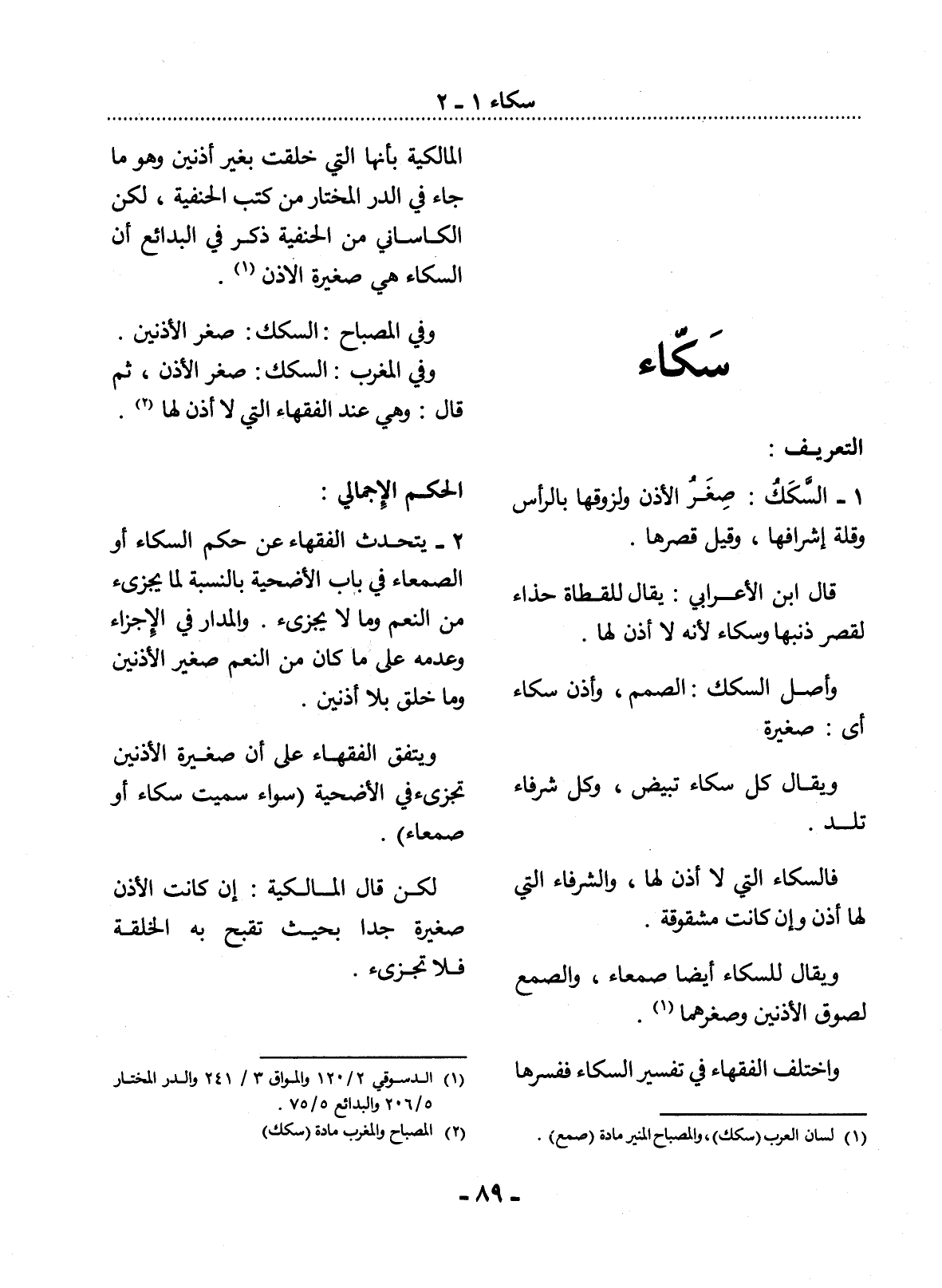 2 - يَتَحَدَّثُ الْفُقَهَاءُ عَنْ حُكْمِ السَّكَّاءِ أَوِ الصَّمْعَاءِ فِي بَابِ الأُْضْحِيَّةِ بِالنِّسْبَةِ لِمَا يُجْزِئُ مِنَ النَّعَمِ وَمَا لاَ يُجْزِئُ. وَالْمَدَارُ فِي الإِْجْزَاءِ وَعَدَمِهِ عَلَى مَا كَانَ مِنَ النَّعَمِ صَغِيرَ الأُْذُنَيْنِ وَمَا خُلِقَ بِلاَ أُذُنَيْنِ.