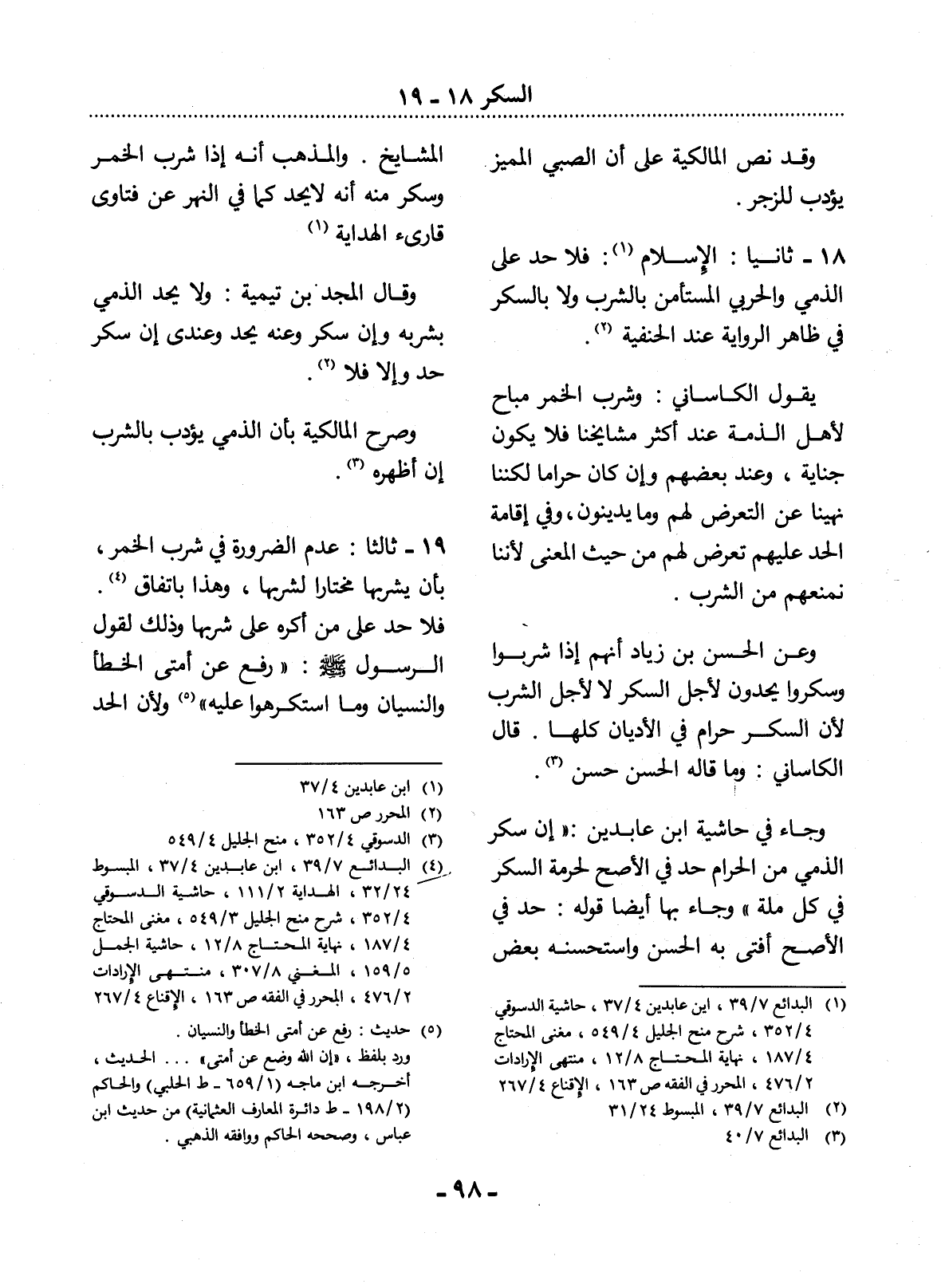 وَعَنِ الْحَسَنِ بْنِ زِيَادٍ أَنَّهُمْ إِذَا شَرِبُوا وَسَكِرُوا يُحَدُّونَ لأَِجْل السُّكْرِ لاَ لأَِجْل الشُّرْبِ لأَِنَّ السُّكْرَ حَرَامٌ فِي الأَْدْيَانِ كُلِّهَا. قَال الْكَاسَانِيُّ: وَمَا قَالَهُ الْحَسَنُ حَسَنٌ (3) .