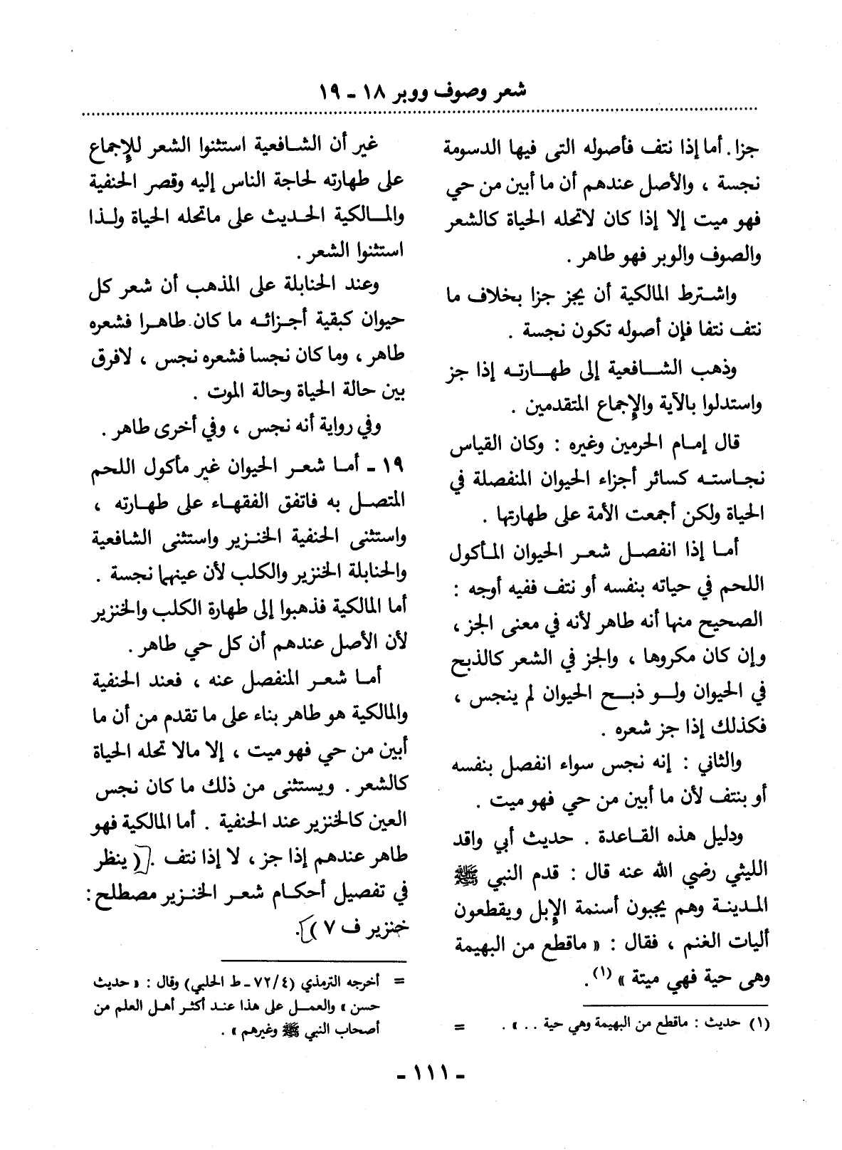 (1) حديث: ما قطع من البهيمة وهي حية. . . . ". أخرجه الترمذي (4 / 72 - ط الحلبي) وقال: " حديث حسن " والعمل على هذا عند أكثر أهل العلم من أصحاب النبي صلى الله عليه وسلم وغيرهم ".