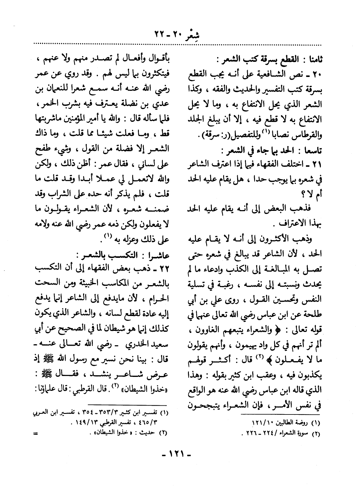 21 - اخْتَلَفَ الْفُقَهَاءُ فِيمَا إِذَا اعْتَرَفَ الشَّاعِرُ فِي شِعْرِهِ بِمَا يُوجِبُ حَدًّا، هَل يُقَامُ عَلَيْهِ الْحَدُّ أَمْ لاَ؟ فَذَهَبَ الْبَعْضُ إِلَى أَنَّهُ يُقَامُ عَلَيْهِ الْحَدُّ بِهَذَا الاِعْتِرَافِ.