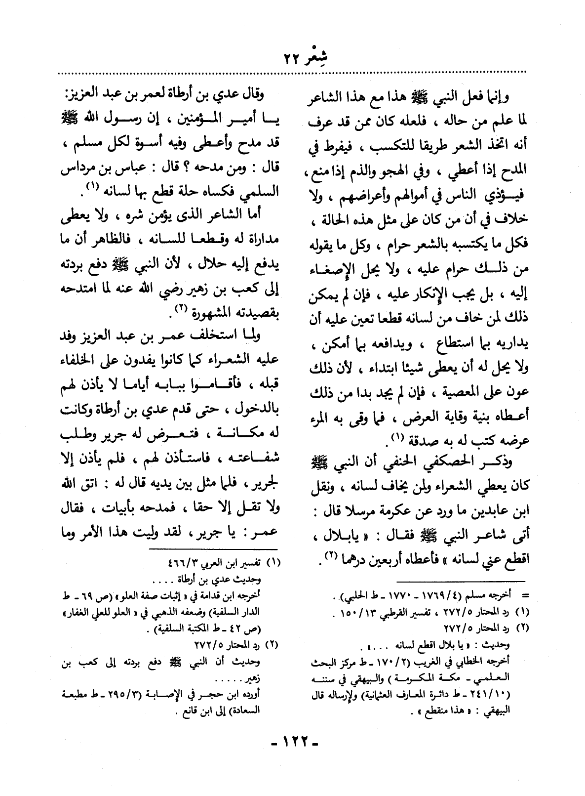 وَقَال عَدِيُّ بْنُ أَرْطَاةَ لِعُمَرَ بْنِ عَبْدِ الْعَزِيزِ: يَا أَمِيرَ الْمُومِنِينَ، إِنَّ رَسُول اللَّهِ صَلَّى اللَّهُ عَلَيْهِ وَسَلَّمَ قَدْ مُدِحَ وَأَعْطَى وَفِيهِ أُسْوَةٌ لِكُل مُسْلِمٍ، قَال: وَمَنْ مَدَحَهُ؟ قَال: عَبَّاسُ بْنُ مِرْدَاسٍ السُّلَمِيُّ فَكَسَاهُ حُلَّةً قَطَعَ بِهَا لِسَانَهُ (1) . أَمَّا الشَّاعِرُ الَّذِي يُؤْمَنُ شَرُّهُ، وَلاَ يُعْطَى مُدَارَاةً لَهُ وَقَطْعًا لِلِسَانِهِ، فَالظَّاهِرُ أَنَّ مَا يُدْفَعُ إِلَيْهِ حَلاَلٌ، لأَِنَّ النَّبِيَّ صَلَّى اللَّهُ عَلَيْهِ وَسَلَّمَ دَفَعَ بُرْدَتَهُ إِلَى كَعْبِ بْنِ زُهَيْرٍ رَضِيَ اللَّهُ عَنْهُ لَمَّا امْتَدَحَهُ بِقَصِيدَتِهِ الْمَشْهُورَةِ (2) .